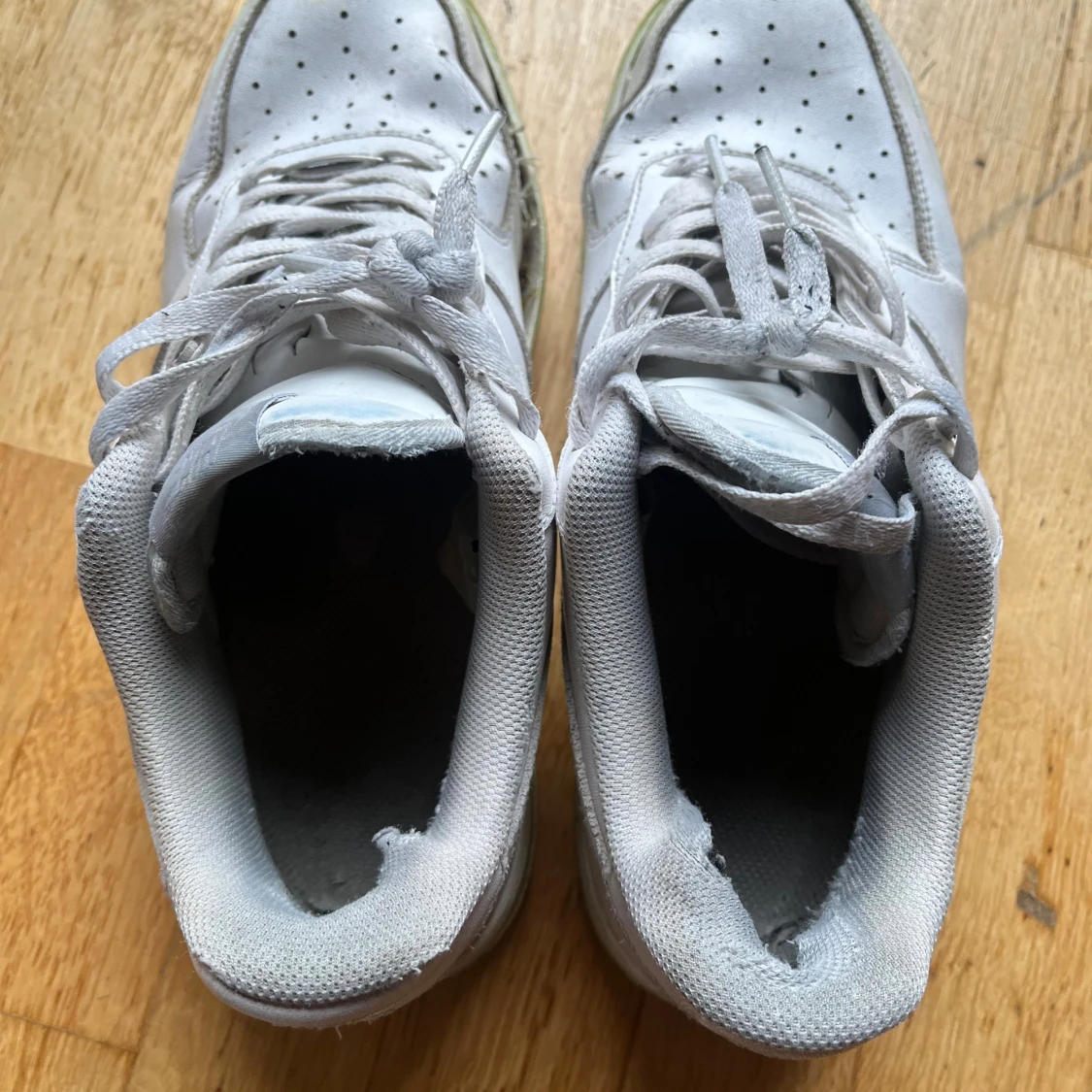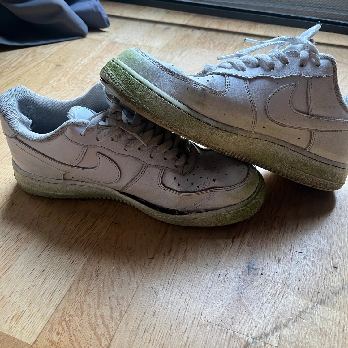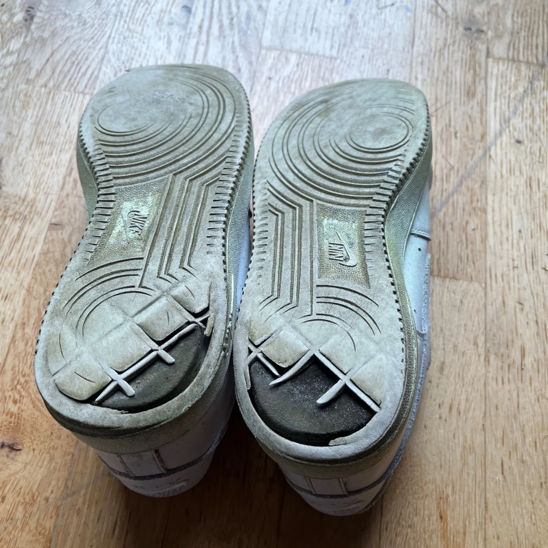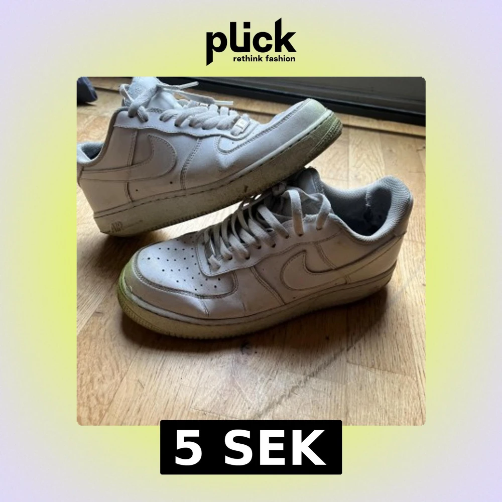 Klassiska Nike Air Force 1 sneakers i vitt skinn med perforerad tå, rund tå och snörning. Låg modell med vit sula och diskret Nike-logga på sidan. Snygg streetstil och passar perfekt till jeans eller shorts.