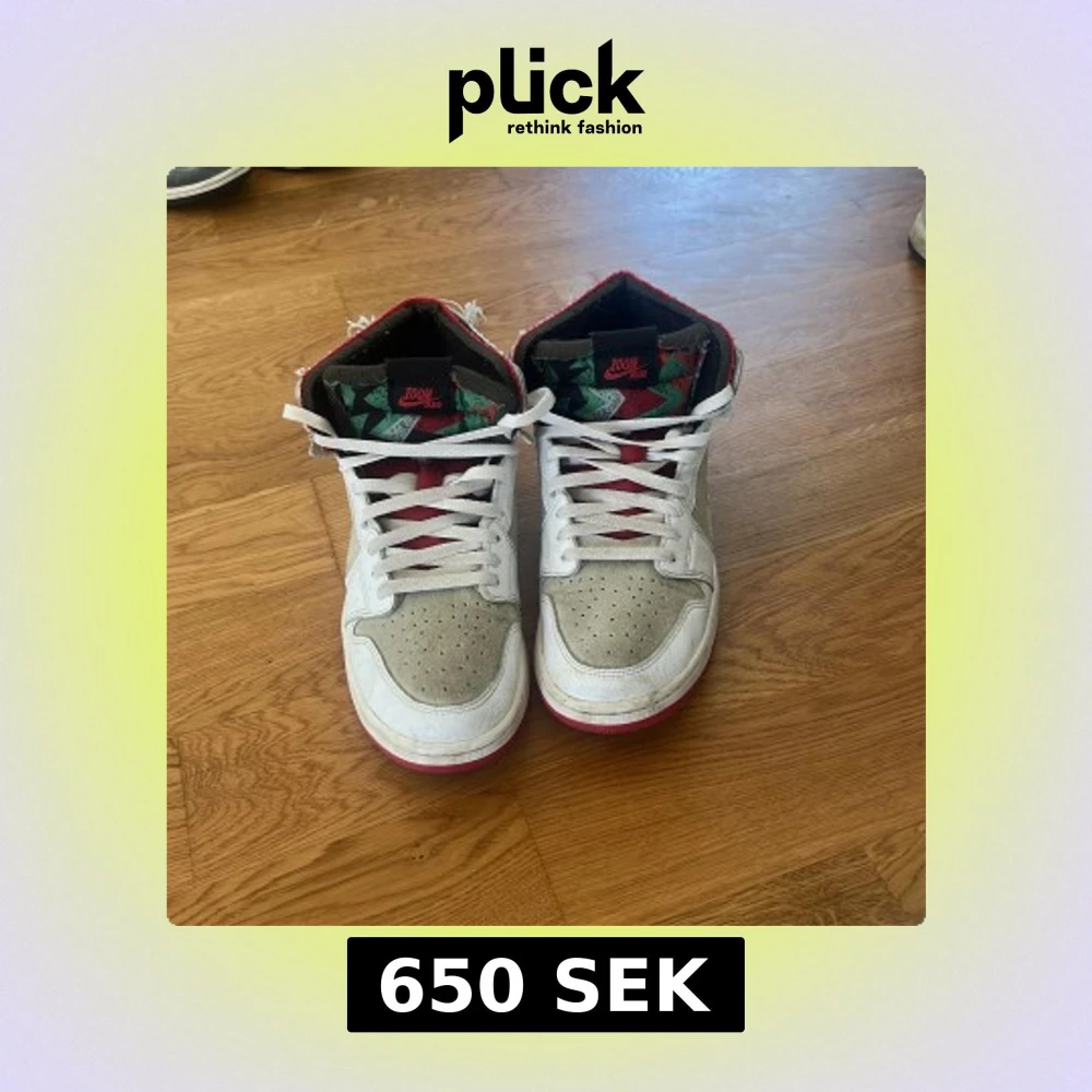 Säljer ett par Nike Air Jordan 1 Retro High OG med vit och beige mocka, röda detaljer och vit sula med röd undersida. Skorna har snörning och ikonisk Air Jordan-logga på sidan. Insidan har färgglatt mönster och ovandelen är i mix av skinn och mocka.