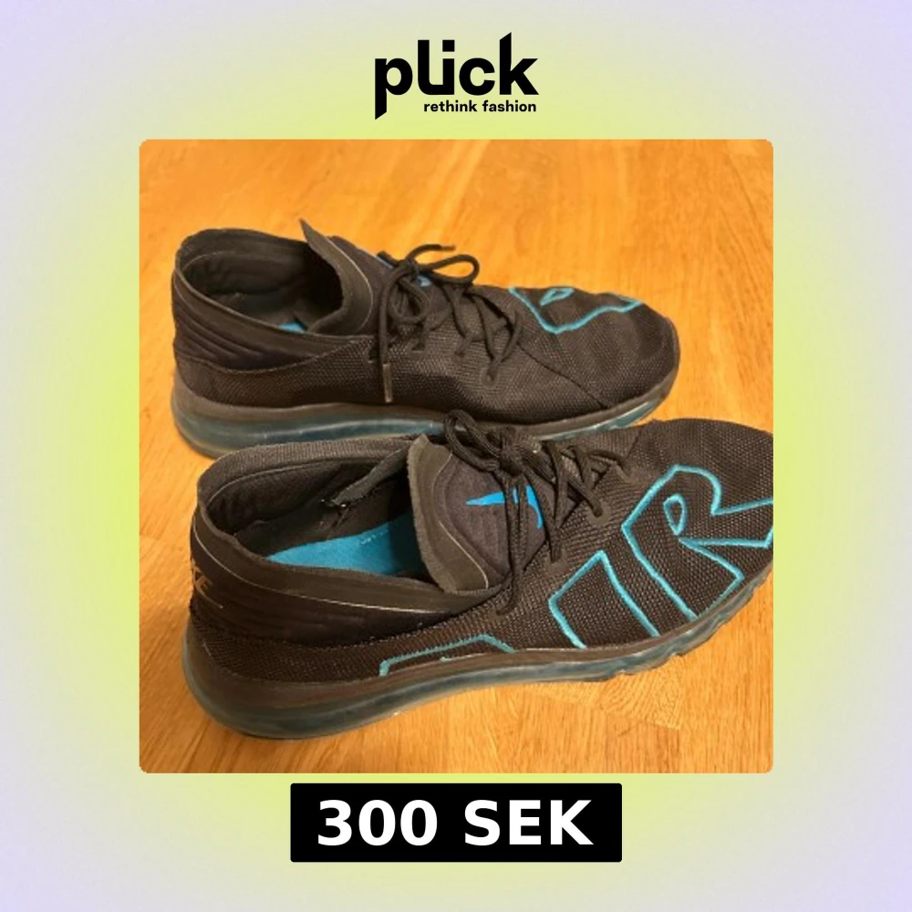 Nike Air Max sneakers i svart med stora blå AIR-detaljer på ovansidan. Skorna har snörning, platt sula med synlig luftkudde och rund tå. Ovandelen är i syntetmaterial och mesh för bra ventilation. Perfekt för dig som gillar sportig och modern stil.