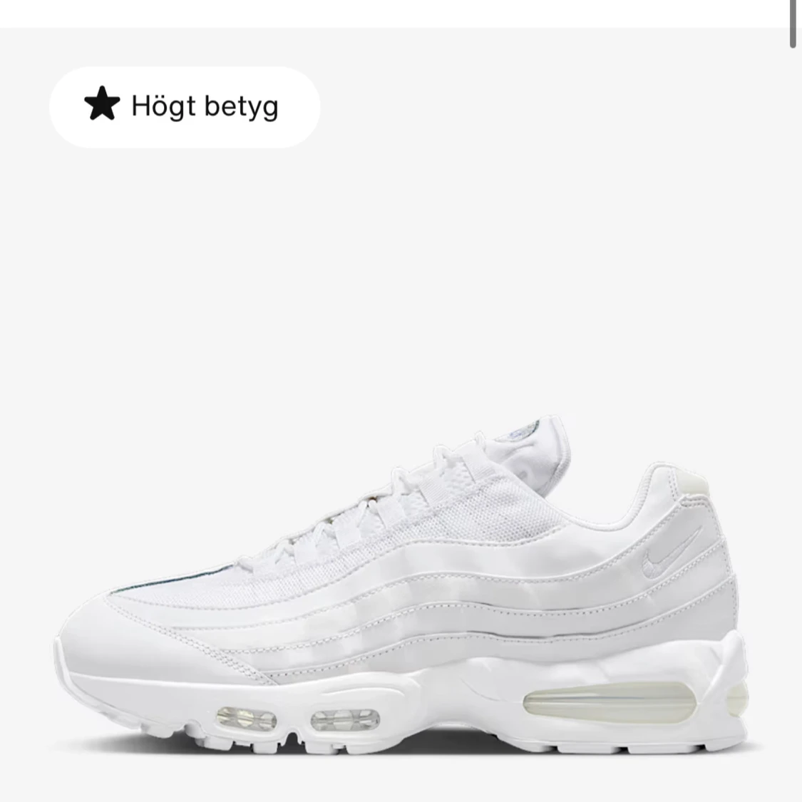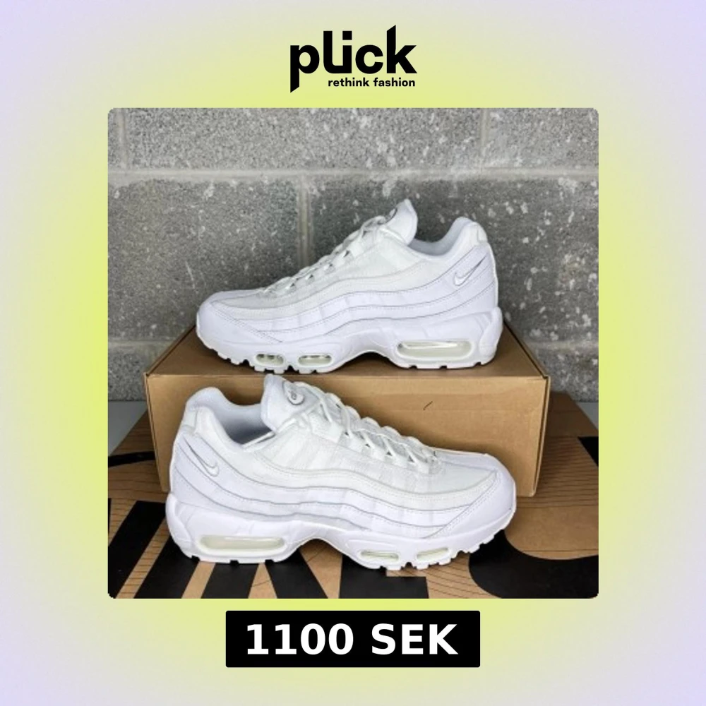 Nike Air Max 95 i helvitt, broderad Swoosh på hälen. Perfekta sneakers för dig som gillar en clean och sportig look. Riktigt bra skor och sköna, använda en gång men jag ska köpa helsvarta istället😊 finns inte ens smuts på dessa 👍