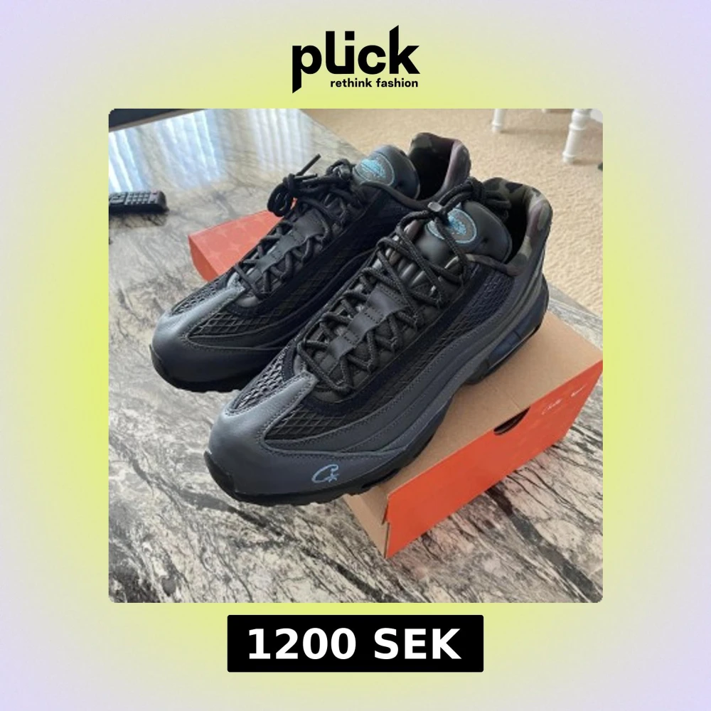 Snygga svarta Nike airmax 95 corteiz sneakers med en sportig design. Skorna har snörning och en kombination av skinn och syntetmaterial. Perfekta för en casual look eller träning.