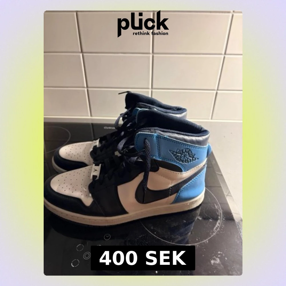 Säljer ett par Nike Air Jordan 1 Mid sneakers i blått, vitt och marinblått skinn. Klassisk high-top siluett med perforerad tå, svart swoosh och snörning. Ikonisk Jordan Wings-logga på sidan och mjuk textil på insidan för extra komfort.