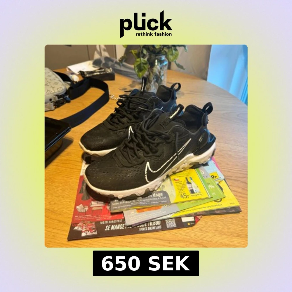 Svarta Nike react vision sneakers med vit sula och vit swoosh. Ovandelen är i syntetmaterial med perforerade detaljer för extra andningsförmåga. Skorna har snörning, rund tå och en chunky, dämpad sula med unika mönster. Perfekta för dig som gillar streetstyle. Som nya jätte bra skick