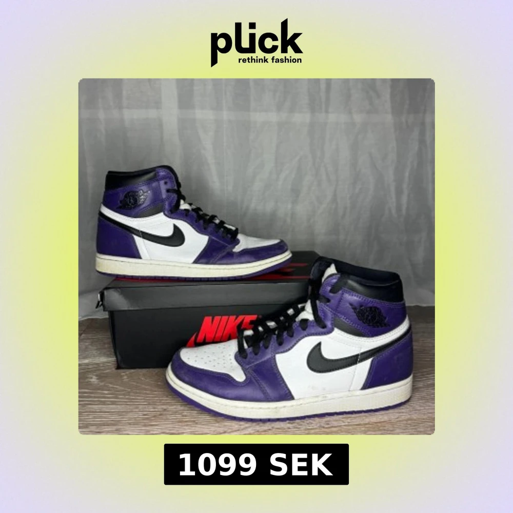Snygga Nike Air Jordans i en cool lila och vit färgkombination. Skorna har en klassisk hög design med svart snörning och Nike-logga på sidan. Perfekta för att ge din outfit en sportig touch.