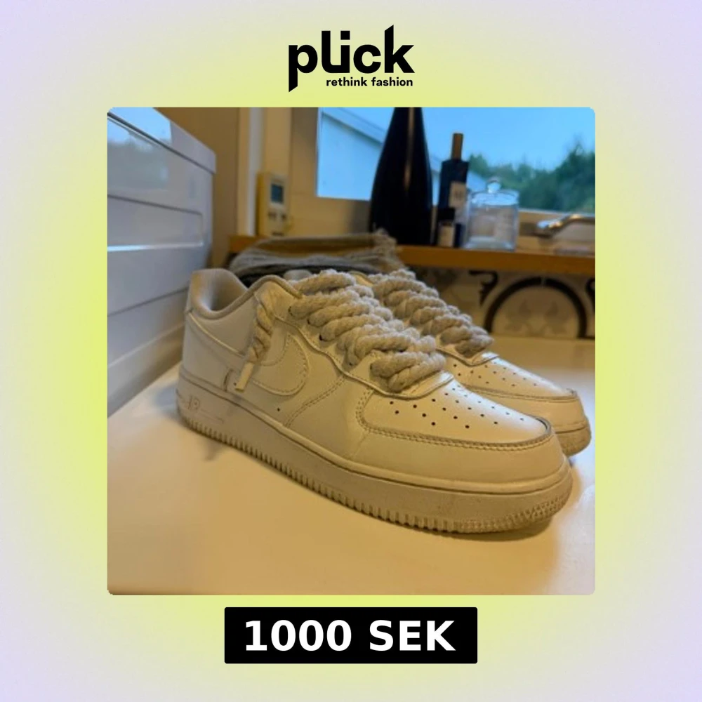 Nike Air Force 1 sneakers i helvitt skinn med chunky, tvinnade vita snören. Klassisk låg modell med perforerad tå och rund sula. Perfekta för dig som gillar en clean och tidlös look med en twist på snörningen.