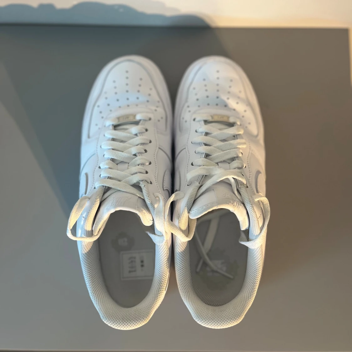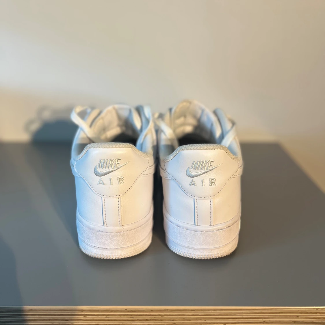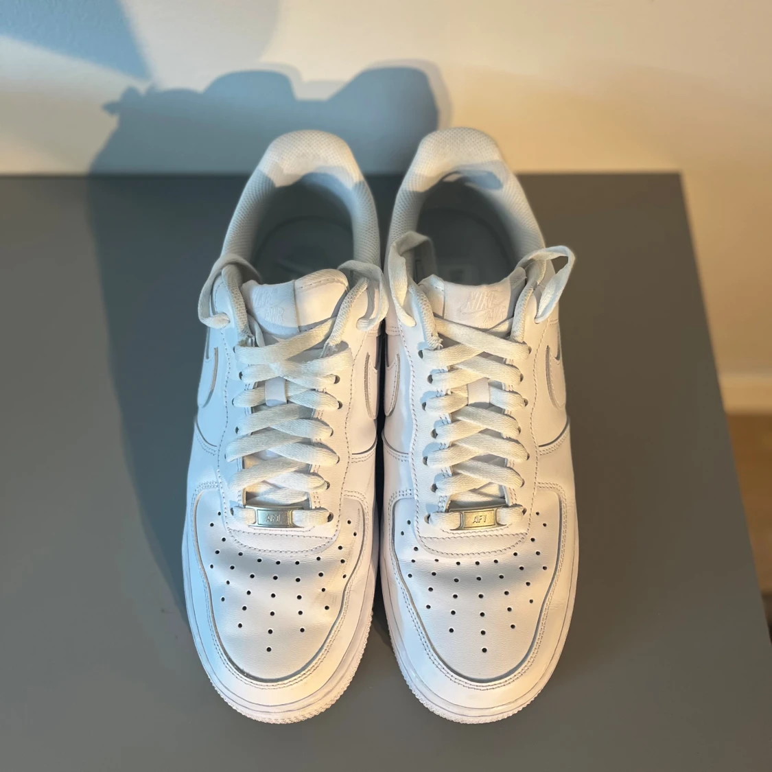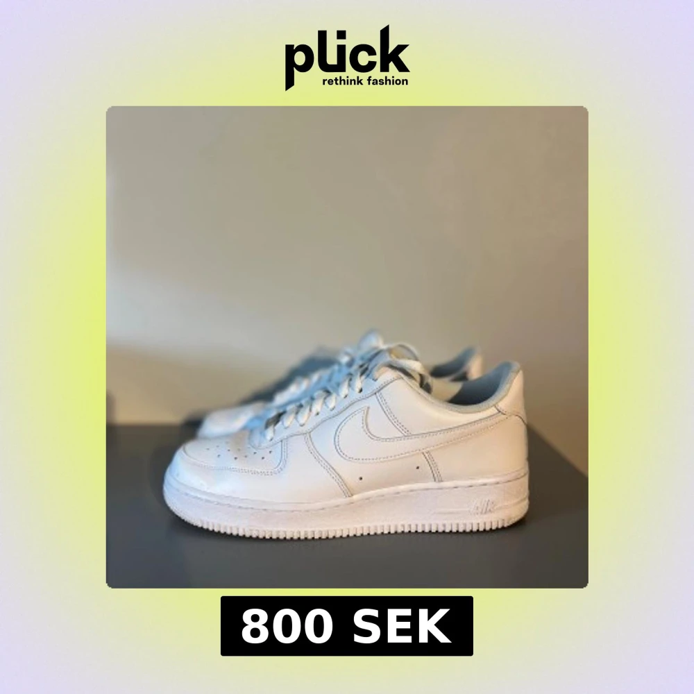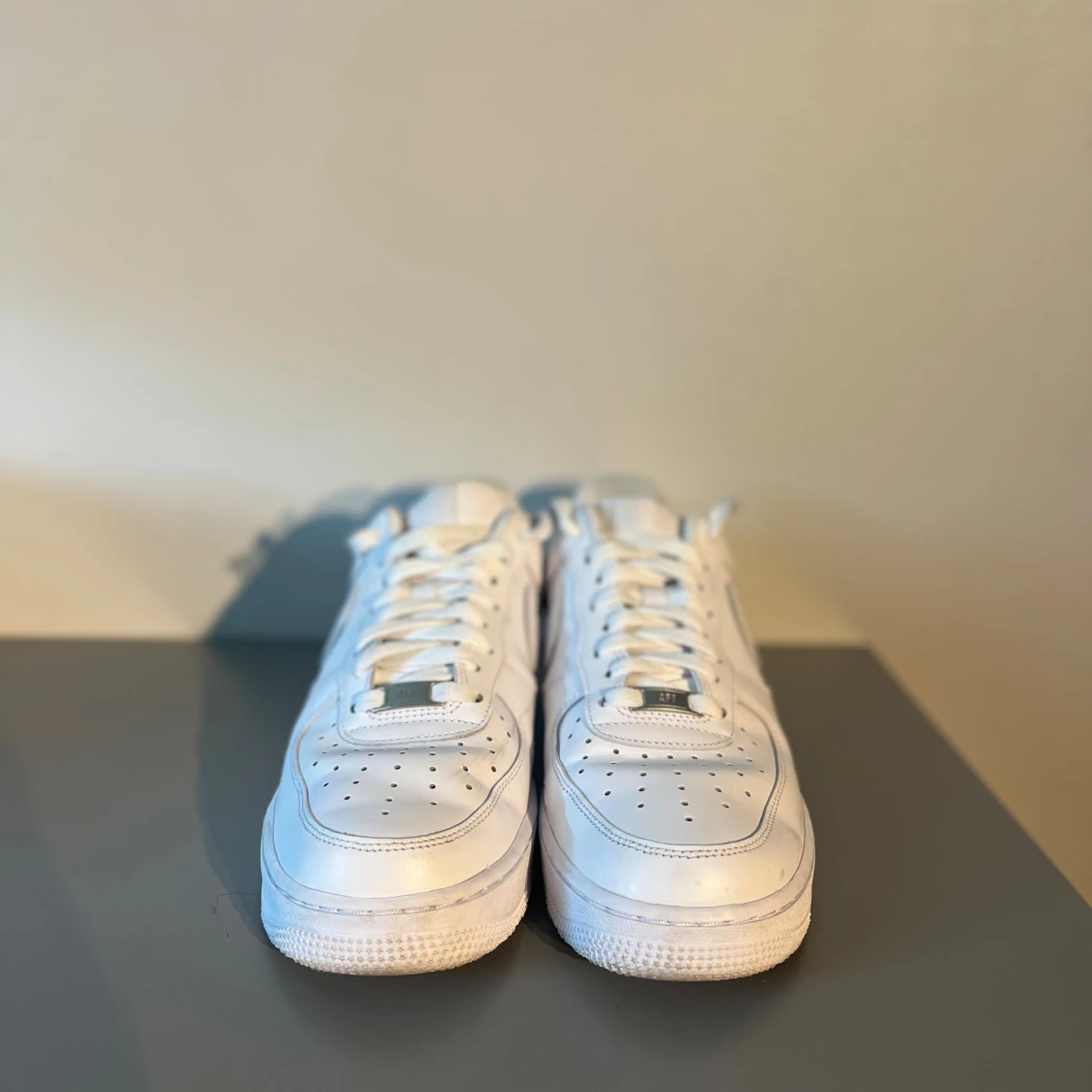 Klassiska Nike Air Force 1 sneakers i helvitt skinn med perforerad tå, rund tå och platt sula. Snygg och tidlös modell med snörning och diskret Nike-logga på sidan. Perfekta för dig som vill ha en clean och stilren look.
