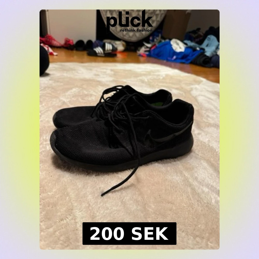 Säljer ett par helsvarta Nike sneakers med klassisk Swoosh-logga på sidan. Skorna har rund tå, platt sula och är tillverkade i ett ventilerande syntetmaterial med mesh-ytor. Perfekta för dig som gillar stilrena och sportiga skor med skön passform.