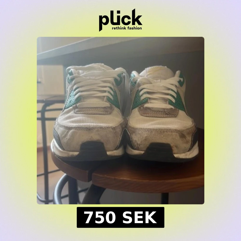 Nike Air Max 90 sneakers med vit mesh och skinn, gröna och svarta detaljer samt klassisk Air Max-sula. Snygg retrostil med rund tå och platt sula, vita snören och tydlig Air Max-logga på sidan och bak. Perfekt för dig som gillar streetwear och sportig vibe. De är använda så finns lite slitningar. Priset går att diskutera