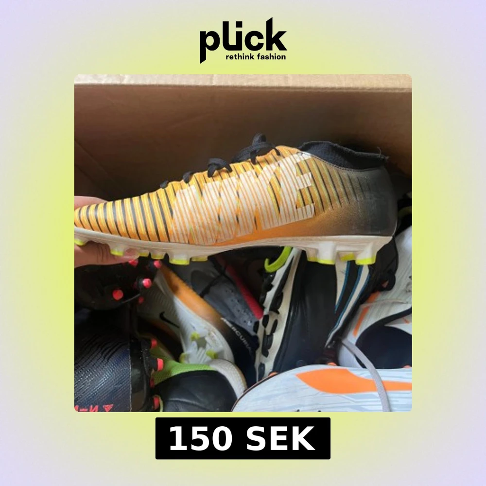 Nike Mercurial fotbollsskor i orange med svarta och vita ränder samt stora vita loggor på sidorna. Skorna har snörning, svart krage och svart häl. Sulan är vit med gula dobbar för bra grepp på planen. Perfekta för dig som vill sticka ut på fotbollsplanen.