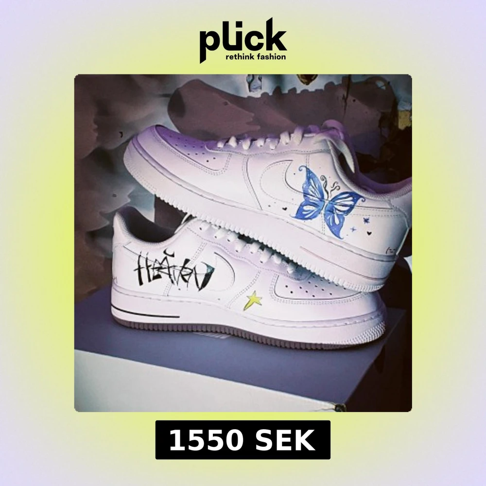 Unika vita Nike Air Force 1 sneakers med handmålade motiv som fjäril, graffiti-text, stjärnor och tecknade figurer. Skorna har klassisk låg siluett, snörning och platt sula. Perfekta för dig som vill sticka ut med en kreativ och personlig stil.