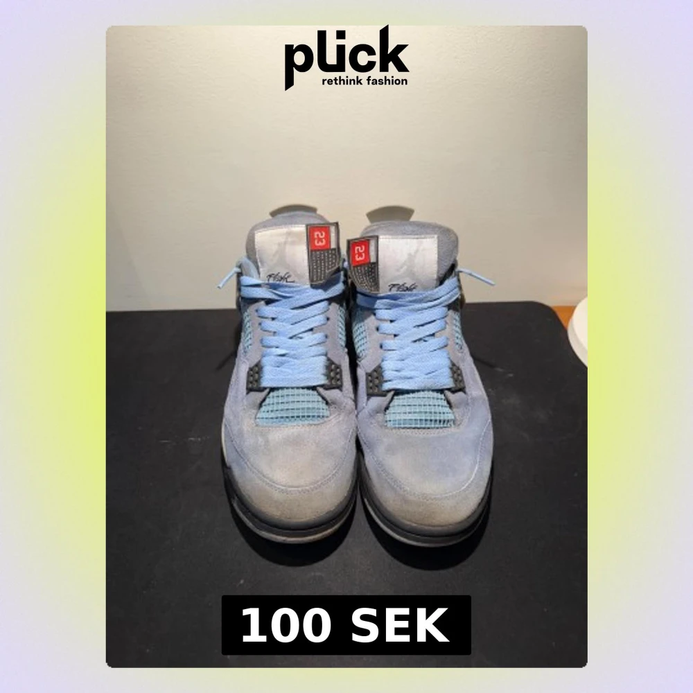 Nike Air Jordan 4 University Blue med ljusblå mocka, svarta och vita detaljer samt meshpaneler. Skorna har klassisk Jordan 4-design med synlig snörning, Jumpman-logga på hälen och tungans 23-detalj. Snygg kontrast mellan blått och grått, perfekt för dig som gillar streetwear.
