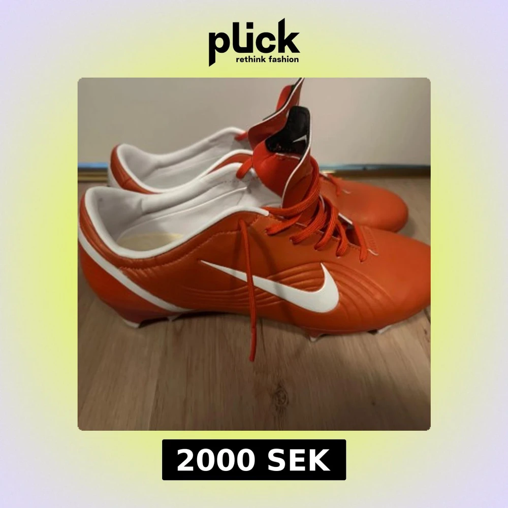 Snygga orangea fotbollsskor från Nike med vit swoosh på sidan och vita detaljer. Skorna har snörning och en rund tå, samt platt sula med dobbar för bra grepp på planen. Insidan är vit och materialet är syntet, perfekt för dig som vill sticka ut på matchen.