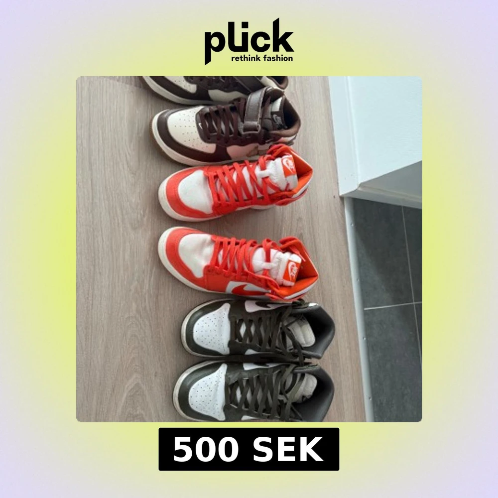 Tre par Nike sneakers: ett par Nike Air Force 1 i brunt och vitt med rutigt swoosh, ett par Nike Jordan 1 i vitt och rött med högt skaft och ett par Nike Dunk i vitt och olivgrönt. Alla har snörning och klassisk rund tå. Perfekta för dig som gillar streetstyle. Skorna längst åt höger är storlek 42,5 de andra 2 är storlek 43 500kr styck