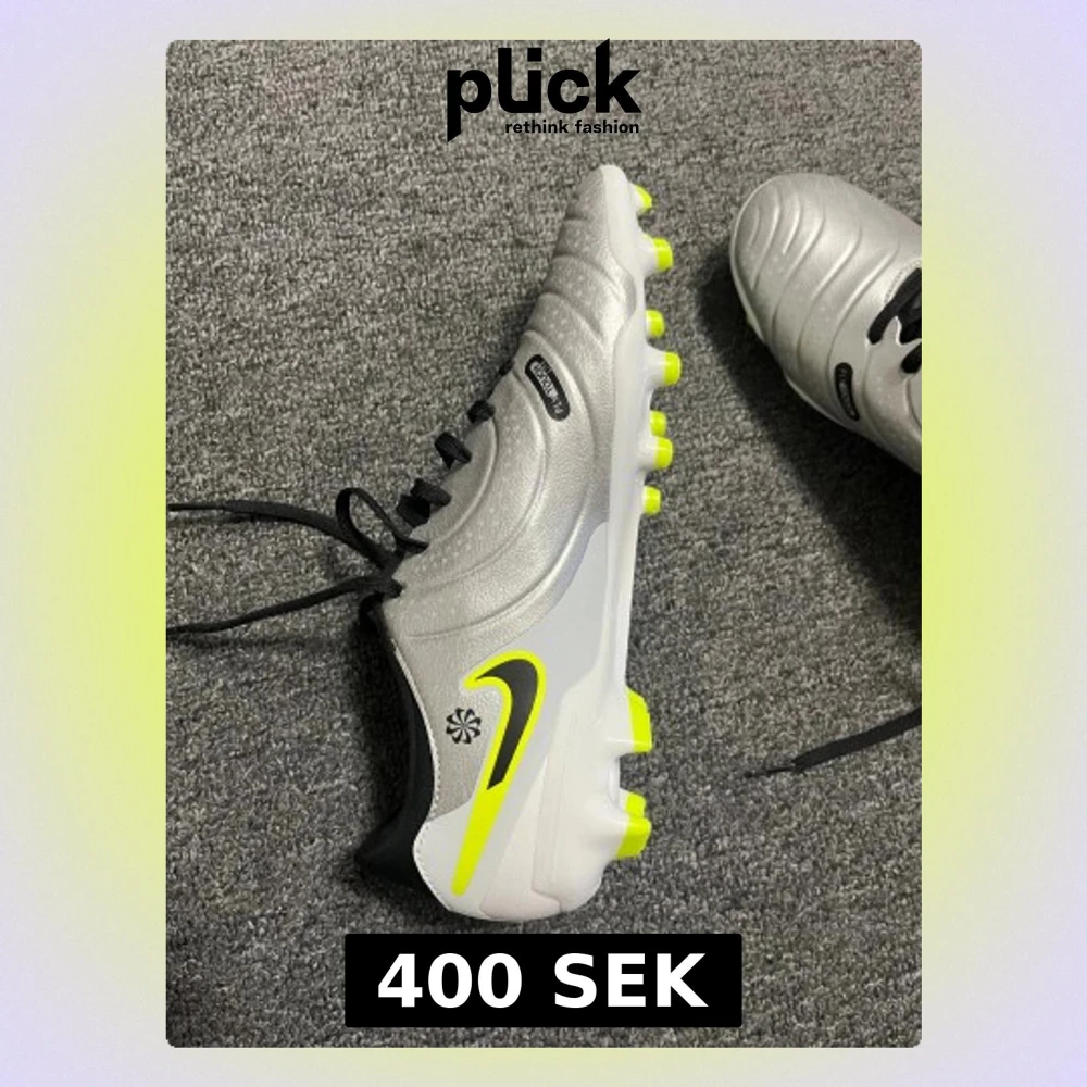 Säljer ett par Nike Tiempo fotbollsskor i grått med svarta och neongula detaljer. Skorna har snörning, rund tå och platt sula med dobbar för gräsplan. Ovandelen är i syntetmaterial och insidan har en fräsch neongul färg. Perfekta för dig som vill sticka ut på planen.