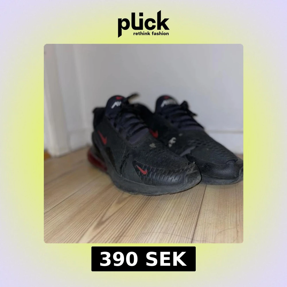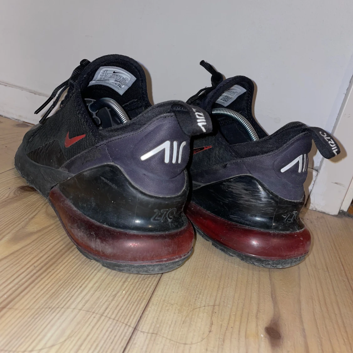 Säljer ett par svarta Nike Air Max 270 med röda detaljer. Skorna har en luftig design med snörning och en synlig Air-enhet i hälen för extra komfort. Lite hål vid tårna dock