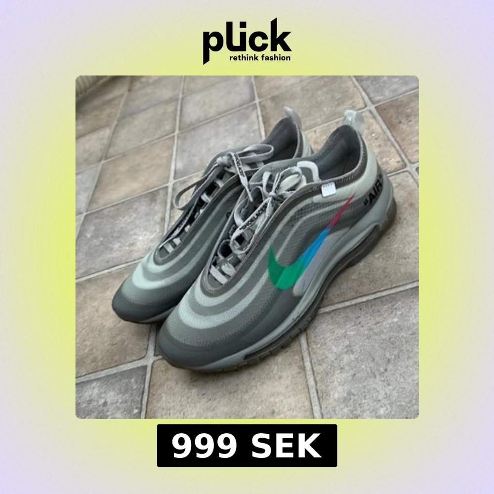 Säljer ett par Nike Air Max 97 i samarbete med Off-White. Skorna är gråa med ikoniska Off-White detaljer, text på snörena och en färgglad swoosh i grönt, blått och rött. Synlig Air Max-sula och Off-White logga på innersulan. De är precis som orginalet.