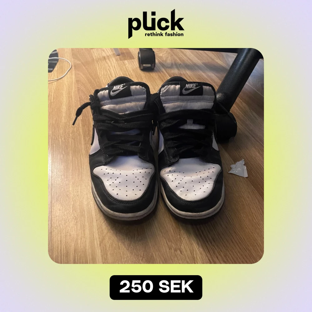 Säljer ett par klassiska svartvita Nike sneakers i bra skick. De har en snygg kontrast mellan svart och vitt med den ikoniska Nike-loggan på sidan. Perfekta för vardagsbruk eller en avslappnad stil. Skorna har snörning och en bekväm passform.