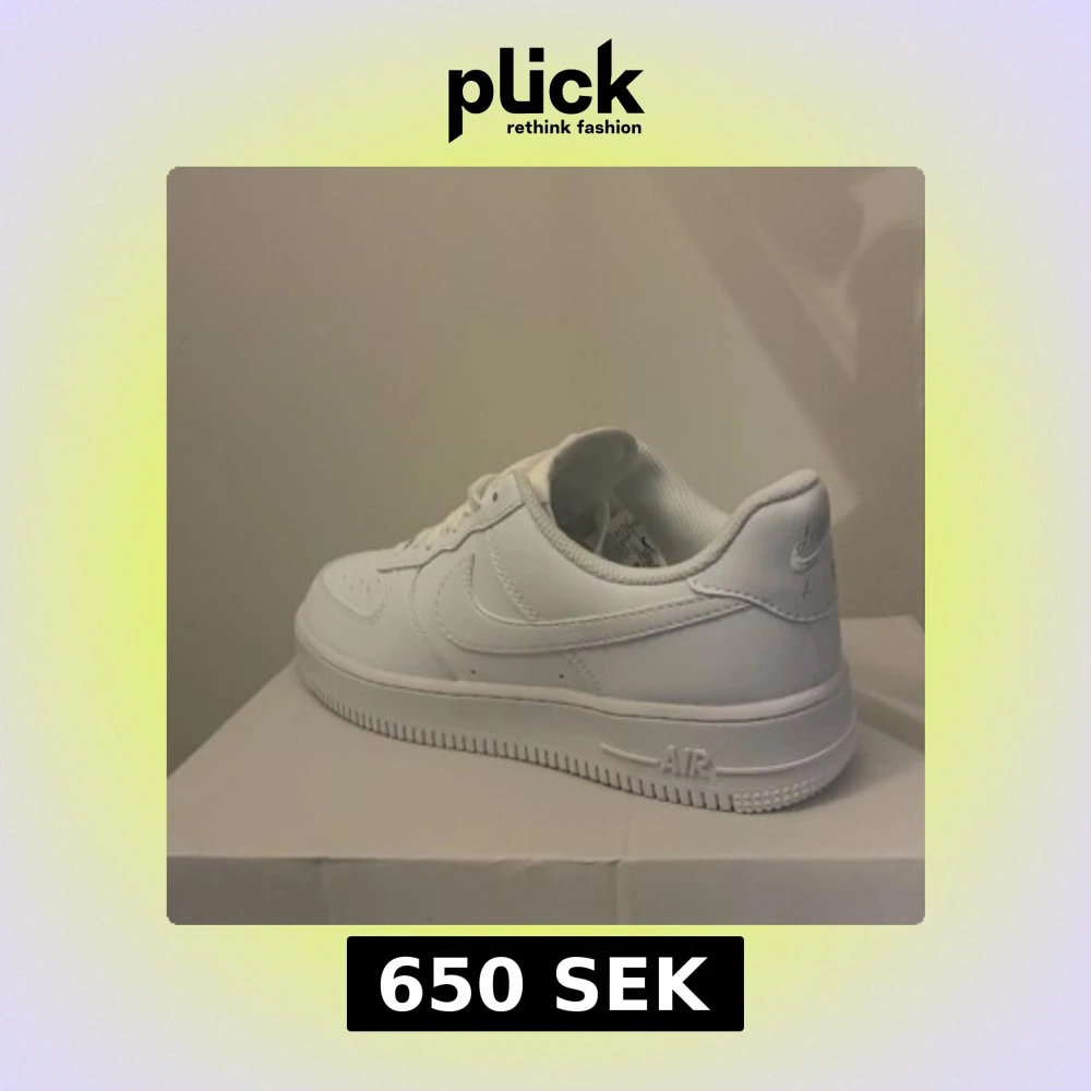 Klassiska Nike Air Force 1 sneakers i helvitt skinn. Modellen har låg profil, rund tå, perforeringar på tån för extra ventilation och snörning framtill. Snygg och tidlös design med Nike-logga på sidan och AIR-detalj på sulan. Perfekta för en clean och stilren look.