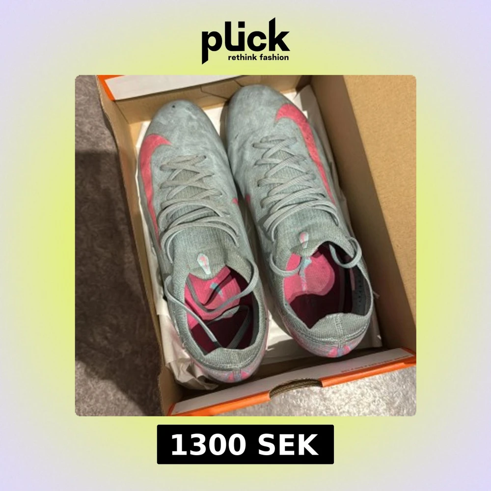 Säljer ett par grå Nike fotbollsskor med snygga rosa swoosh-detaljer och turkosa dobbar. Skorna har snörning och är designade för att ge bra grepp på planen. Perfekta för dig som vill sticka ut med stil på matchen.