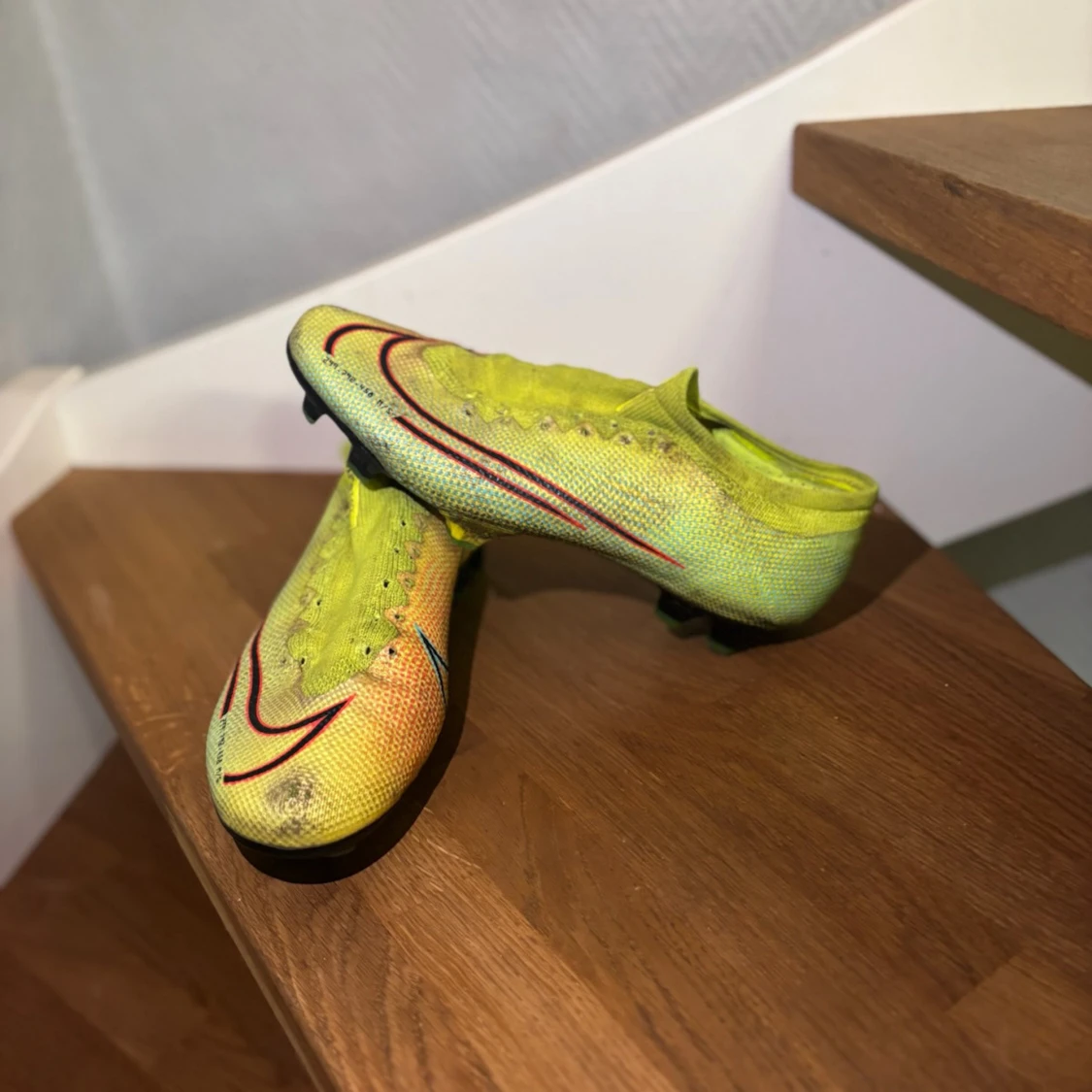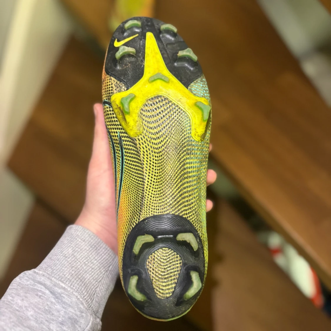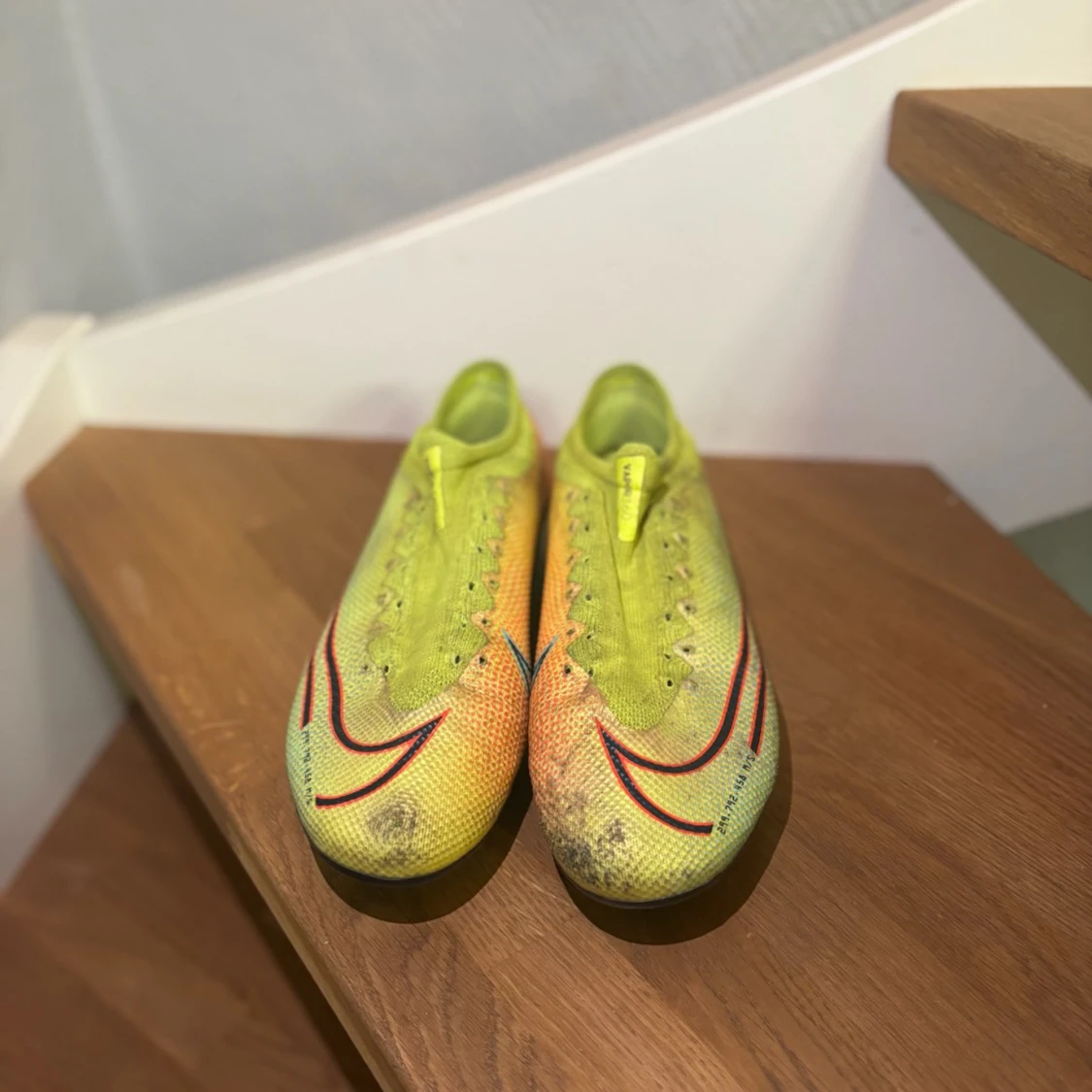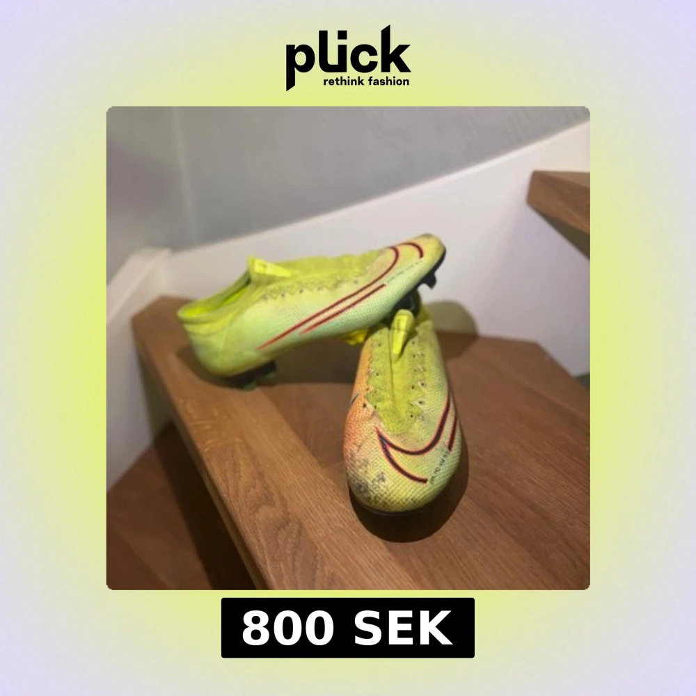 Säljer ett par gula fotbollsskor från Nike med snörning och en iögonfallande design. Skorna har en grön och orange toning med svarta detaljer på sulan. Perfekta för fotbollsplanen med sin lätta och smidiga konstruktion.