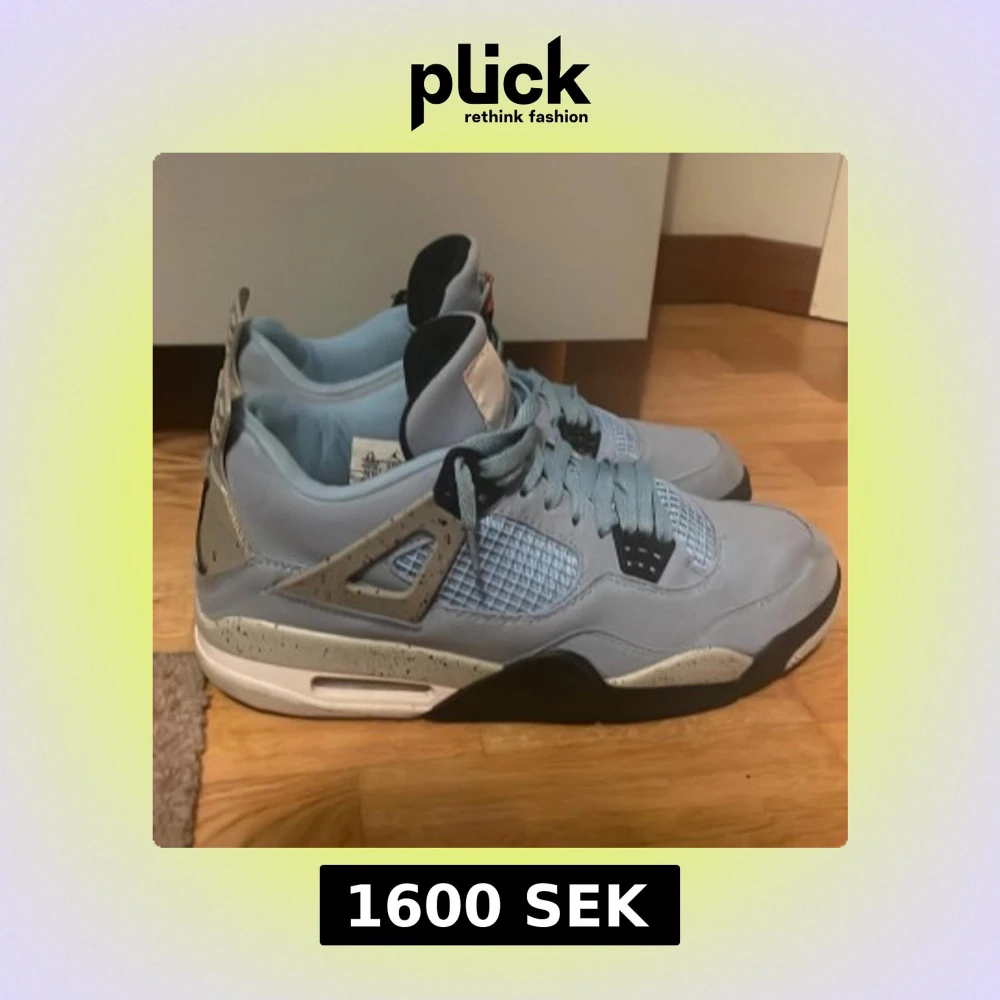 Nike Air Jordan 4 University Blue sneakers med ljusblå mocka, meshpaneler och grå detaljer med svarta stänk. Ikonisk Jordan -logga på hälen och tungans etikett. Skorna har snörning, svart och vit sula samt coola retrovibbar. Perfekta för dig som vill sticka ut Eller fån bra skott på basketplanen