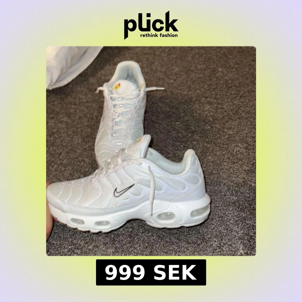 Säljer ett par fräscha vita Nike Air Max Plus sneakers med mesh- och syntetöverdel, ikoniska vågiga detaljer och synliga Air-enheter i sulan. Skorna har svart Swoosh-logga på sidan och klassisk snörning. Perfekta för dig som gillar sportig och clean stil.