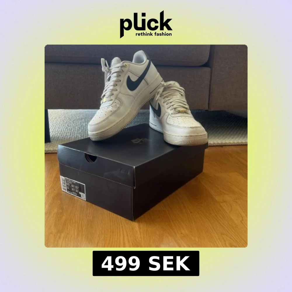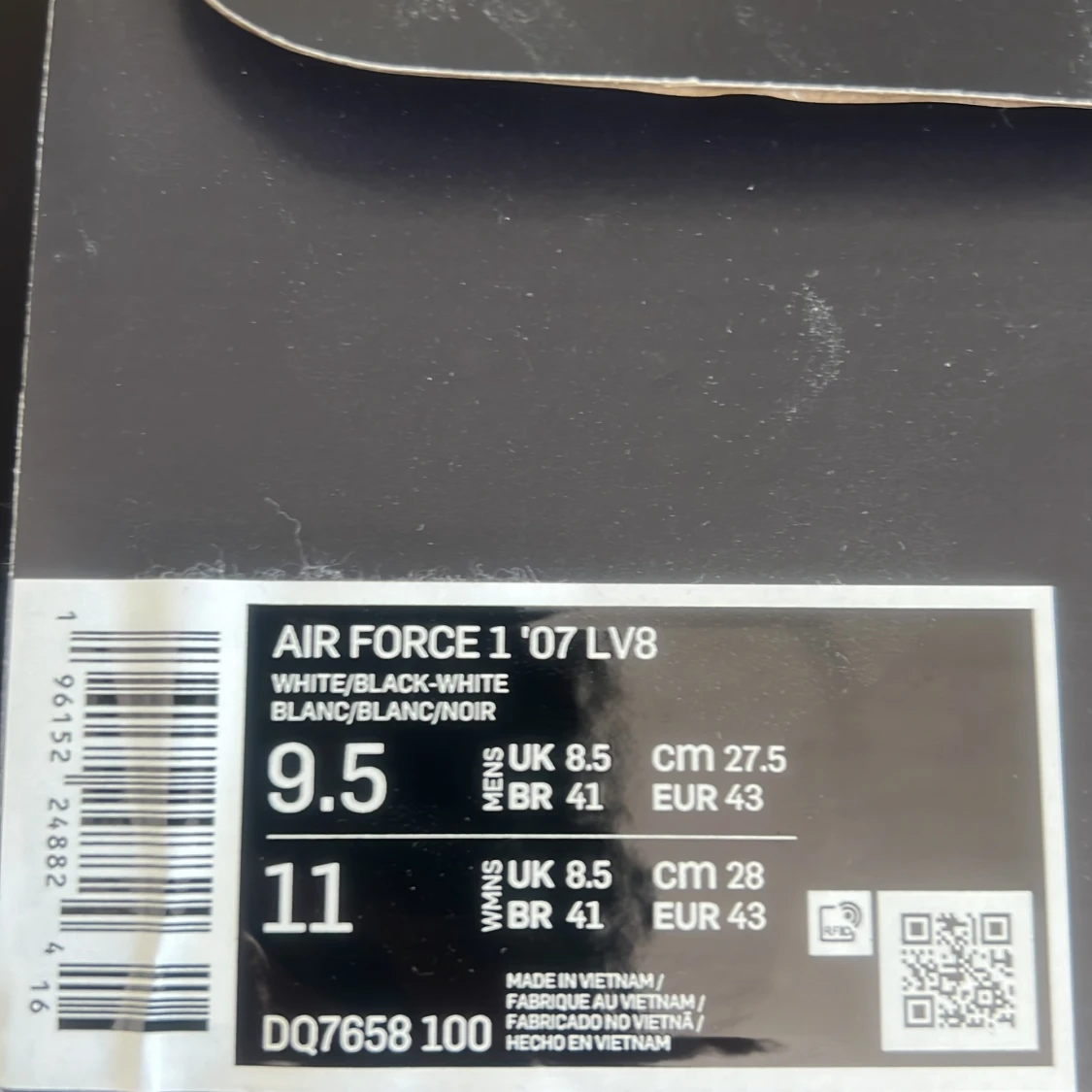 Klassiska Nike Air Force 1 '07 LV8 sneakers i vitt skinnliknande material med svarta swoosh-loggor och detaljer i guld på snörningen. Lågt skaft, perforerad tå och platt sula. Perfekta för dig som gillar en clean och tidlös look.