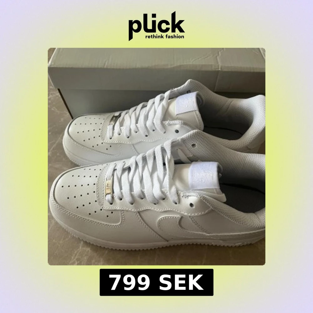 Klassiska Nike Air Force 1 sneakers i helvitt skinn med vit sula och vita skosnören. Ikonisk design med perforerad tå, metallbricka med 'AF1' och broderad Nike-logga på tungan. Perfekt för dig som gillar stilrena och tidlösa sneakers.