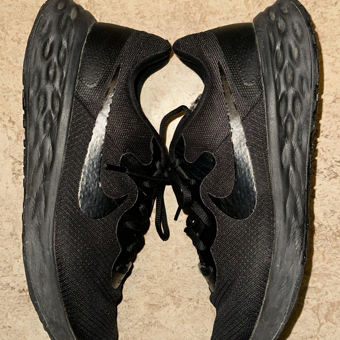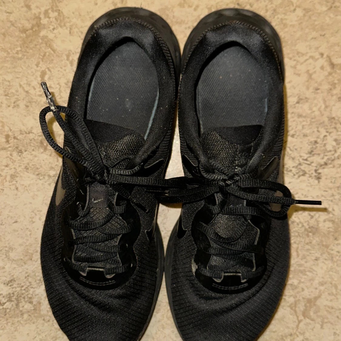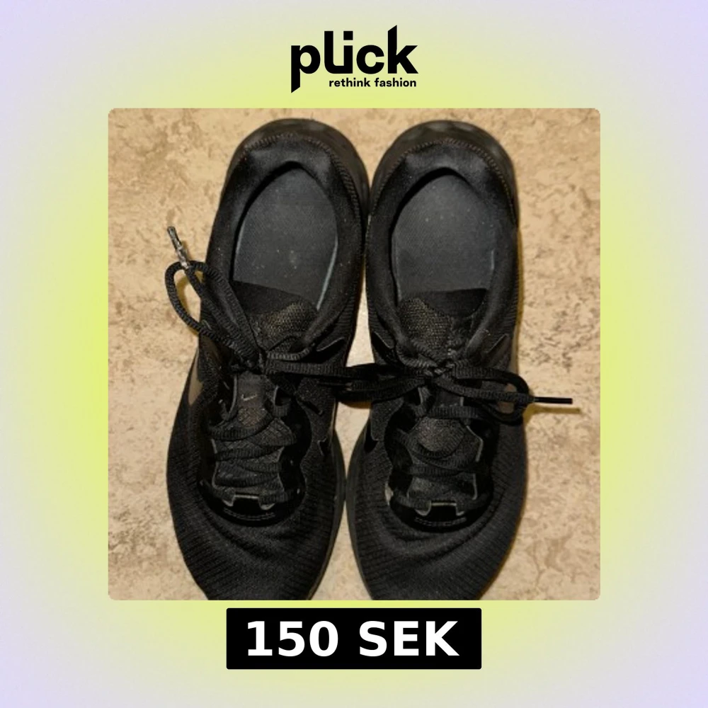 Säljer ett par svarta Nike sneakers med snörning. Skorna har en stilren design med en svart sula och Nike-logga på sidan. Perfekta för vardagsbruk och träning.