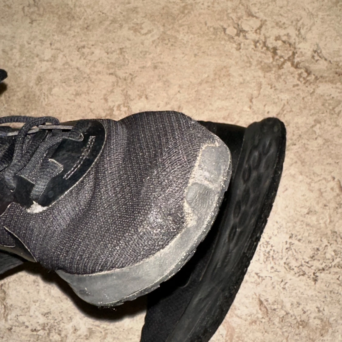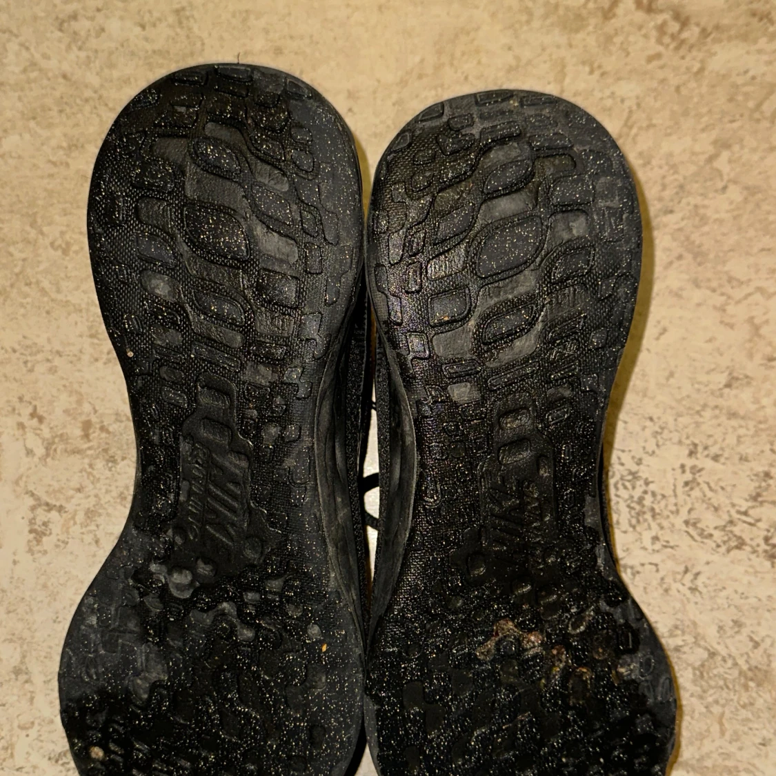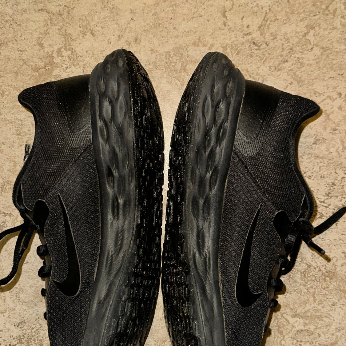 Säljer ett par svarta Nike sneakers med snörning. Skorna har en stilren design med en svart sula och Nike-logga på sidan. Perfekta för vardagsbruk och träning.