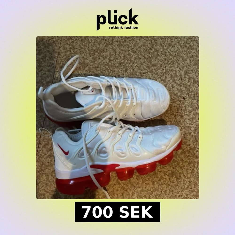 Nike Vapormax Plus sneakers i vitt med röda detaljer och en riktigt fet röd genomskinlig sula. Snyggt mönstrad ovandel i syntetmaterial, klassisk snörning och ikonisk Nike-logga på sidan. Perfekta för dig som vill sticka ut med en modern och sportig look.