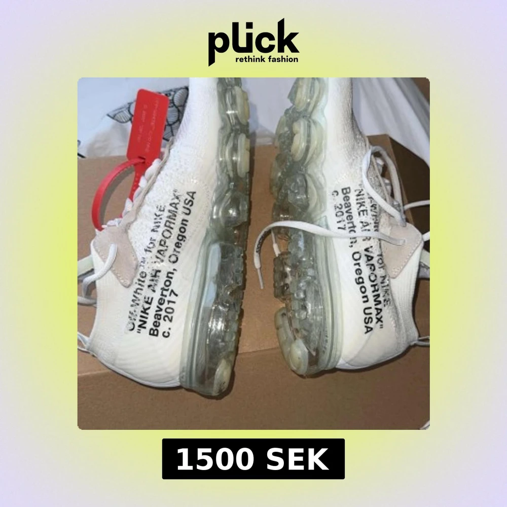 Säljer ett par exklusiva Nike Air Vapormax i samarbete med Off-White. Skorna är vita med transparent sula och har den ikoniska Off-White texten på sidan. De har snörning och en röd tagg som detalj. Perfekta för den som vill ha något unikt och stilrent.