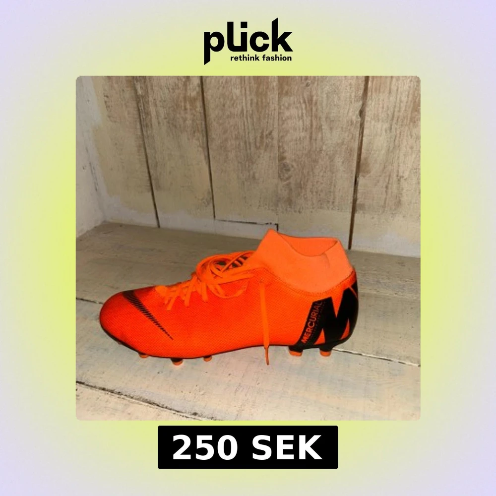 Säljer ett par Nike Mercurial fotbollsskor i en riktigt snygg orange färg med svarta detaljer. Skorna har snörning, rund tå och platt sula med dobbar för bra grepp på planen. Perfekta för dig som vill sticka ut på fotbollsplanen.