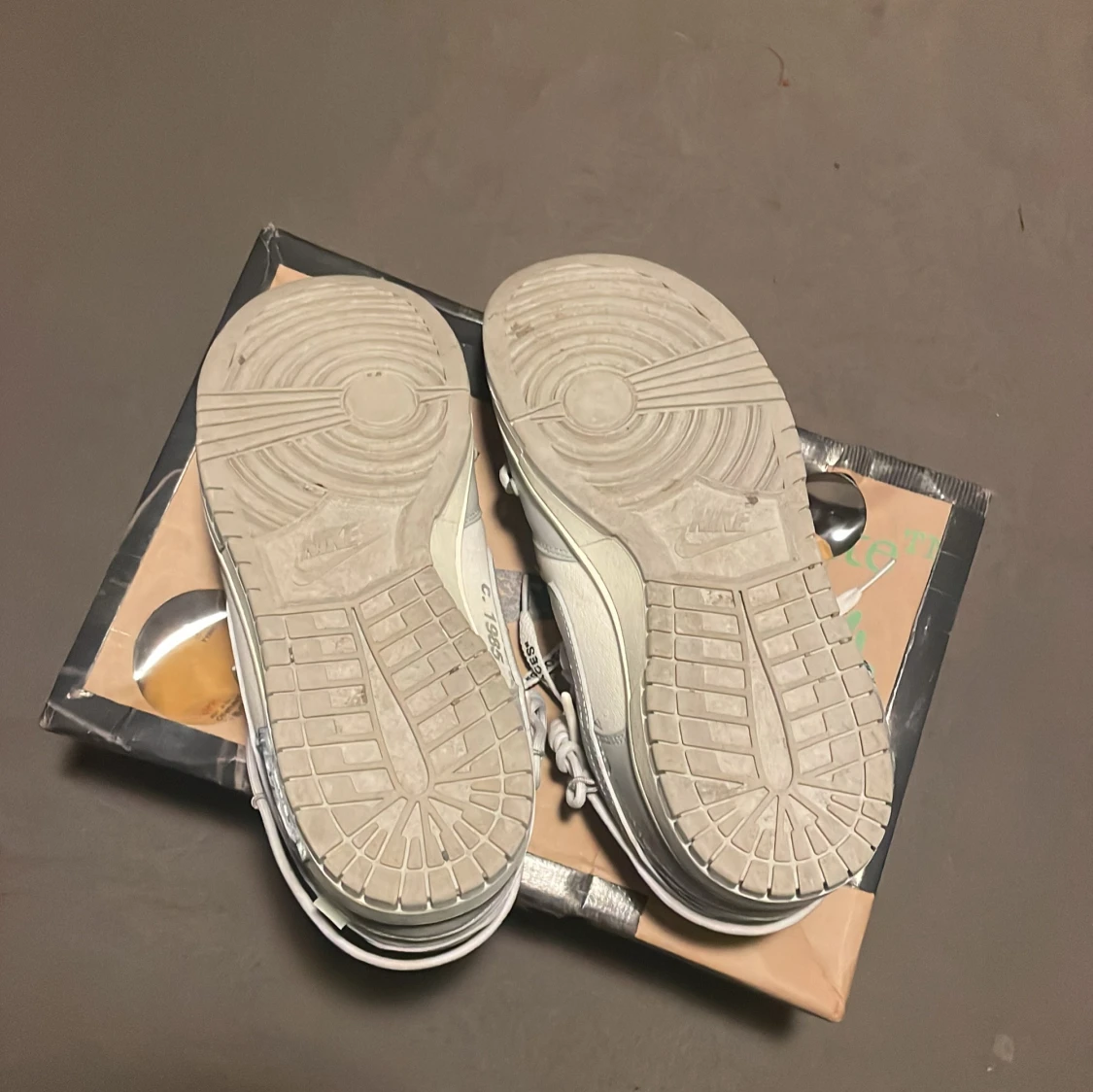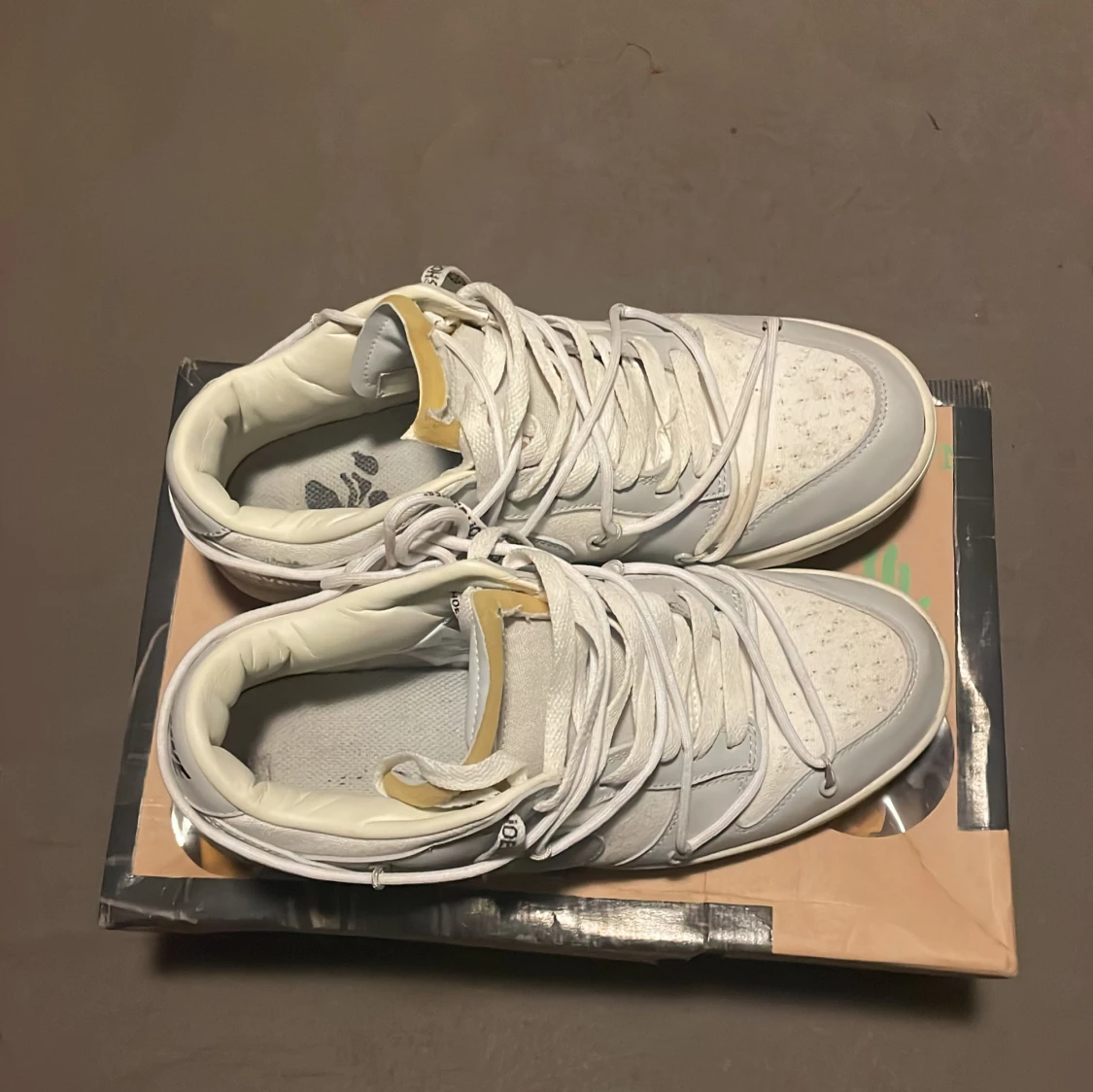 Säljer ett par vita Nike sneakers med unik design och textdetaljer på sidan. Skorna har snörning och en extra snörningsdetalj över ovansidan. Perfekta för dig som gillar en stilren men ändå iögonfallande look. Dunks, knappt använda, passade inte direkt.