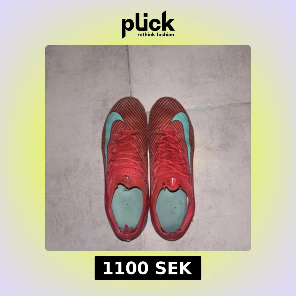 Säljer ett par Nike Mercurial fotbollsskor i en snygg rosa färg med turkosa detaljer och snörning. Skorna har en låg profil och är tillverkade i syntetmaterial för bästa känsla på planen. Perfekta för dig som vill sticka ut med stil på fotbollsplanen. Men är använd då en hel säsong, och om ni vill ha bilder efter jag har tvättat dem så kan ni bara skriva till mig privat!
