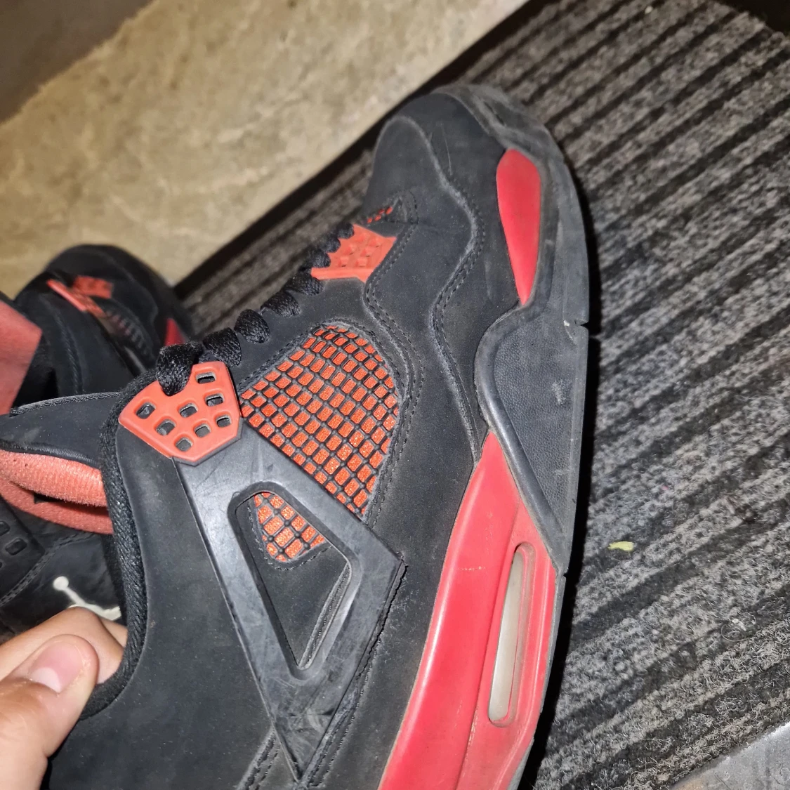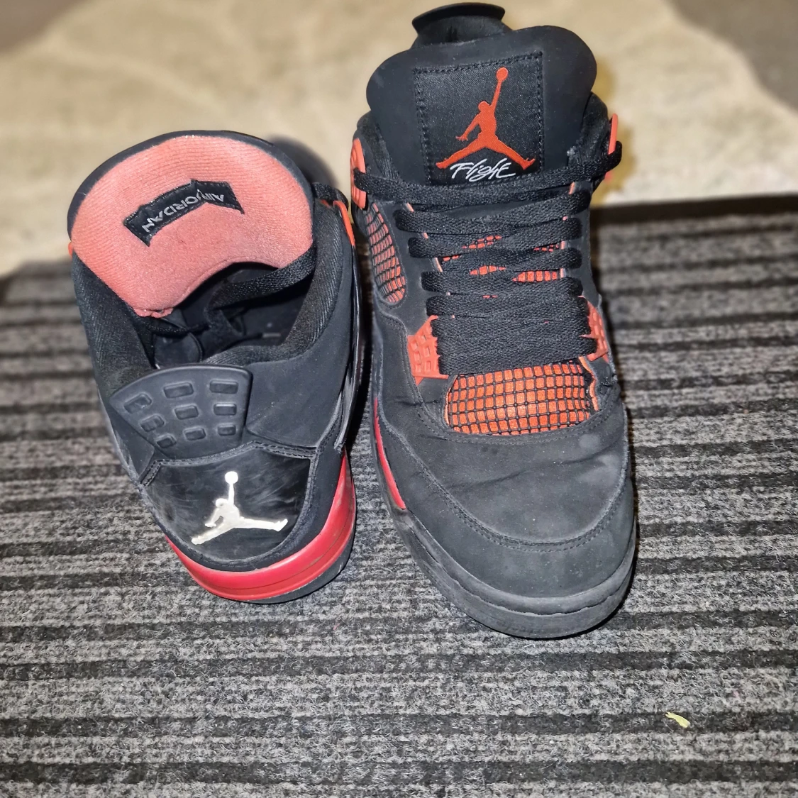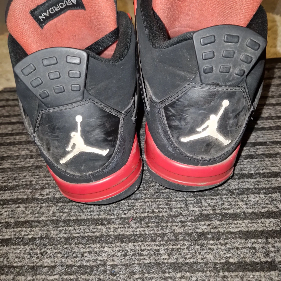 Säljer ett par svarta och röda Nike Air Jordans med klassisk Jumpman-logga på hälen. Skorna har svarta snören, meshdetaljer och röda accenter på sula och snörning. Perfekta för dig som gillar streetwear och sneakers med attityd.
