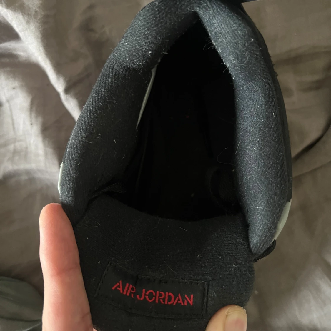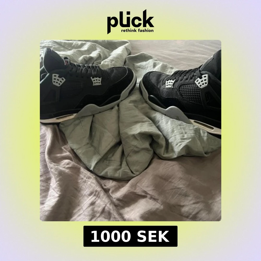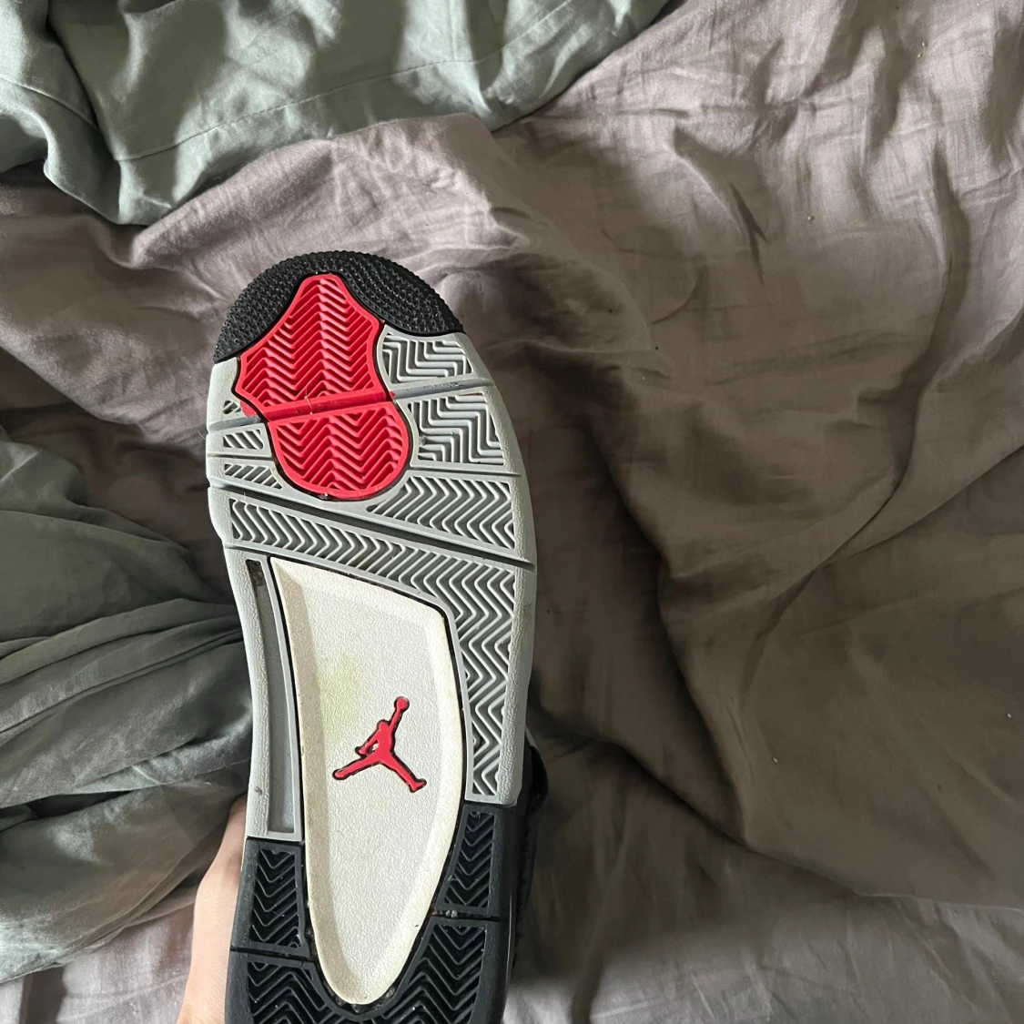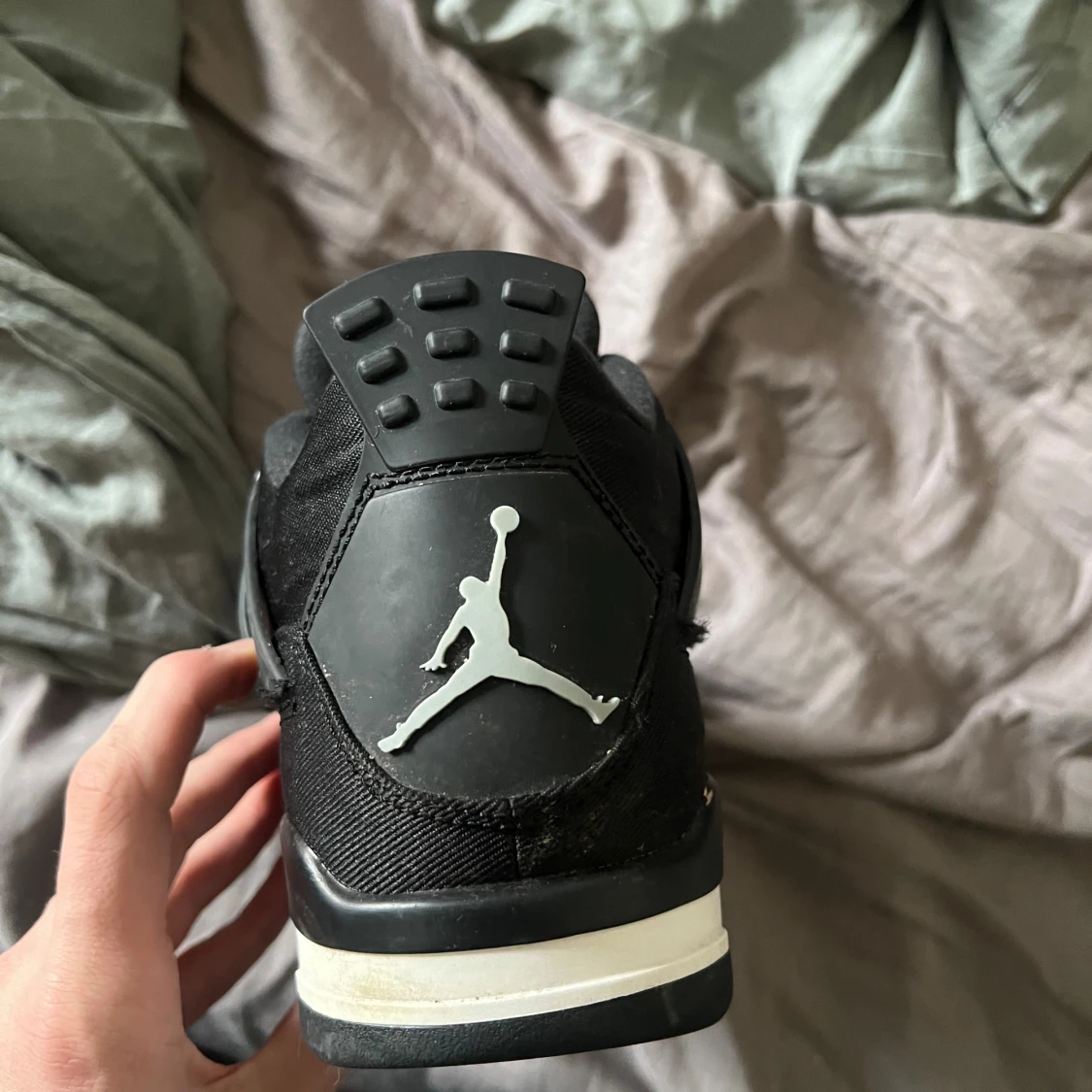 Säljer ett par svarta Nike Air Jordan 4 sneakers med grå och vita detaljer samt röd logga under sulan. Skorna har meshpaneler, snörning och den klassiska Jumpman-loggan på hälen. Ovandelen är i mocka och textil, och sulan är i gummi för grym komfort. Knappast använda och perfekta inför vintern