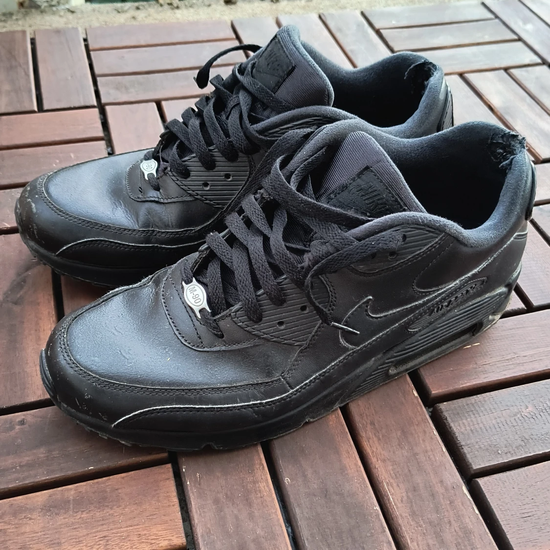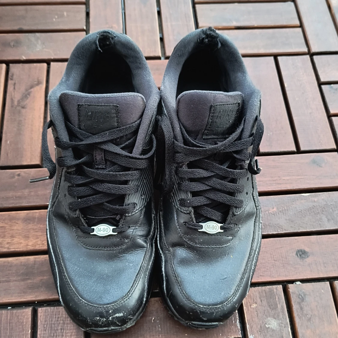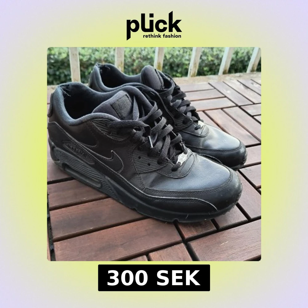Säljer ett par svarta Nike Air Max 90 sneakers med klassisk design och synlig Air-dämpning i sulan. Skorna har snörning, rund tå och är tillverkade i skinn och syntetmaterial. Perfekta för dig som gillar streetstyle och vill ha en ikonisk sneaker i garderoben.