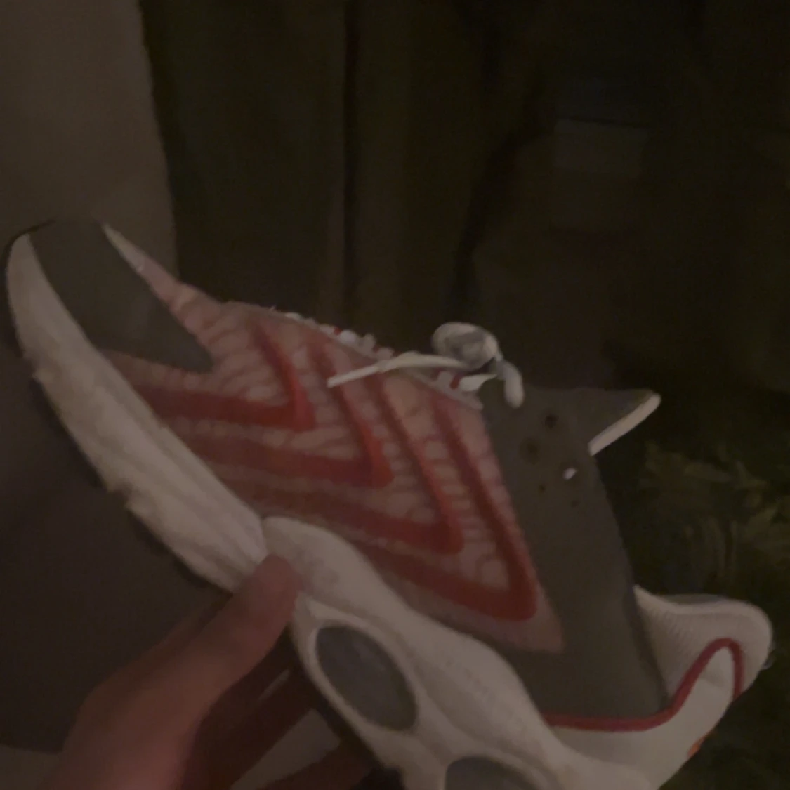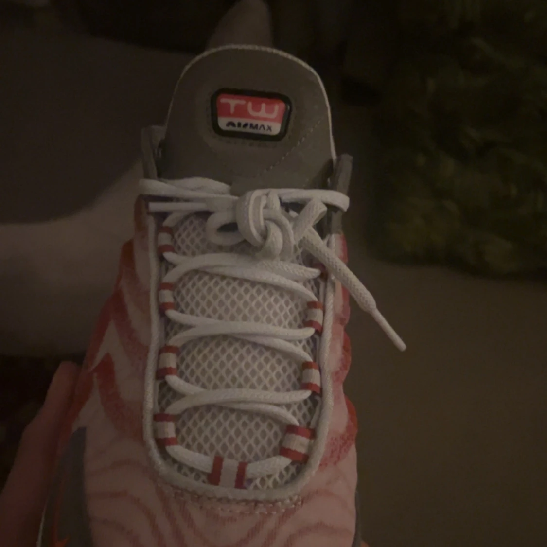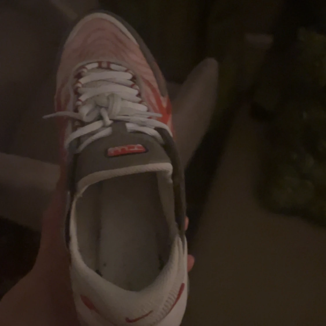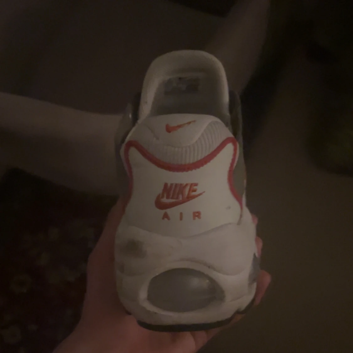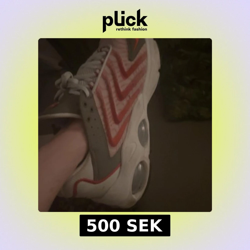 Säljer ett par Nike Air sneakers med vit bas, röda och grå detaljer samt tydliga vågmönster på sidorna. Skorna har snörning och en tjock, vit sula med synliga luftbubblor. Perfekta för dig som gillar sportig stil.
