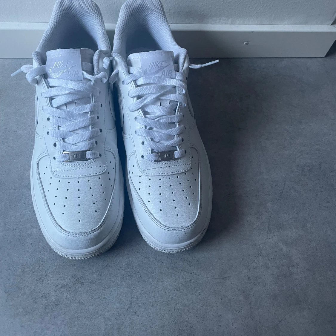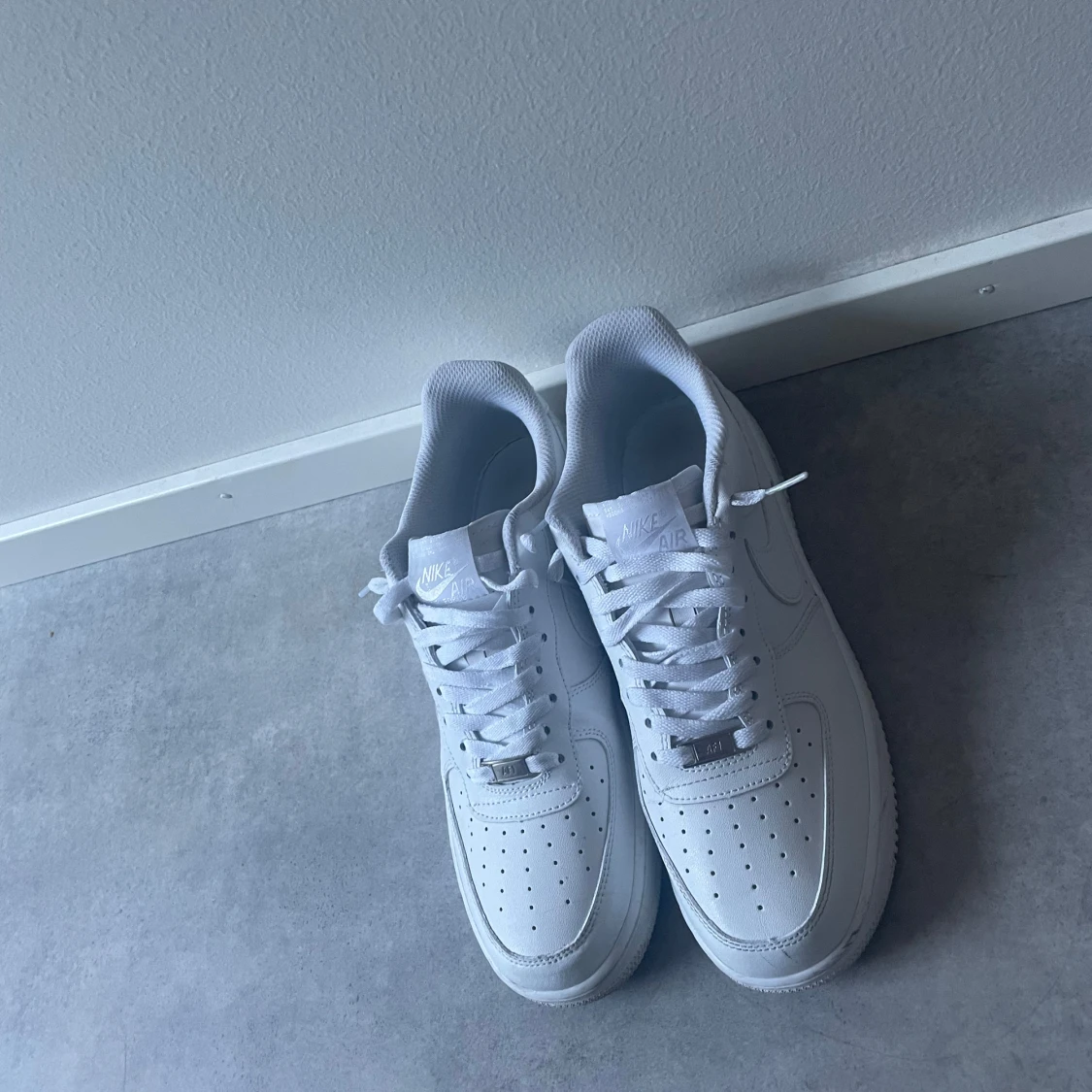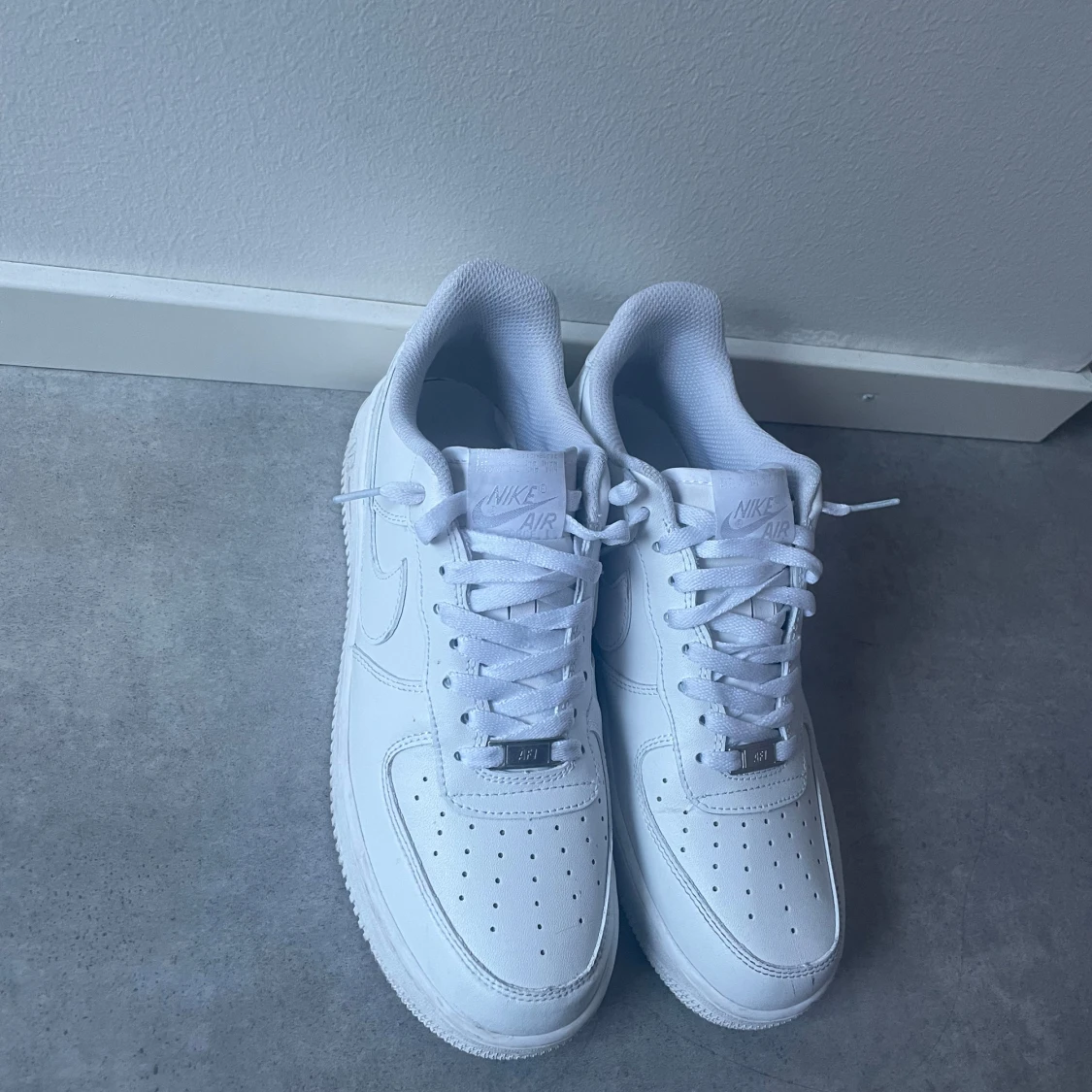 Klassiska Nike Air Force 1 sneakers i helvitt skinn med perforerad tå, rund tå och platt sula. Skorna har snörning och diskret Nike-logga på sidan. Perfekt clean look som funkar till allt och ger en fräsch vibe. 43/44