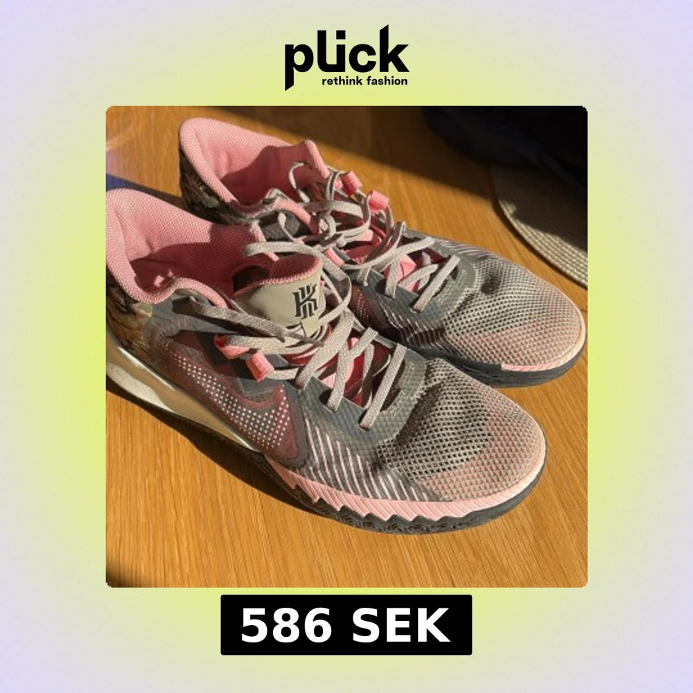 Snygga Nike Kyrie basketskor med grå mesh, rosa detaljer och camo-mönstrade partier på hälen. Skorna har snörning, rund tå och svart sula med rosa logga undertill. Kyrie Irving känd för att göra snabba, rappa skor med bra grepp och stabil mobilitet