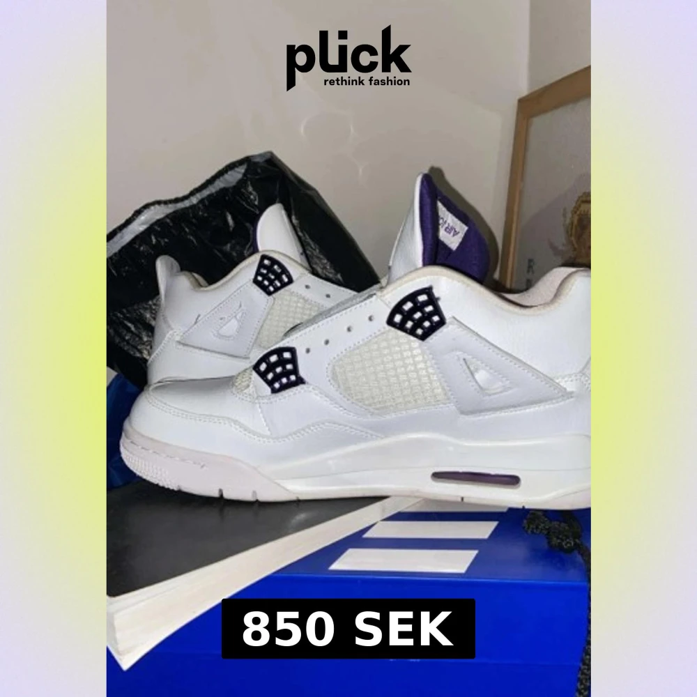 Vet inte hur mycke dom är värde dock men .Säljer ett par Nike Air Jordan 4 sneakers i vitt med lila detaljer. Skorna har en klassisk siluett med meshpaneler på sidorna, snörning och platt sula. Materialet är skinn och syntet, och de har en rund tå. Perfekt för dig som gillar streetwear och vill sticka ut. Använd 4-6 gånger