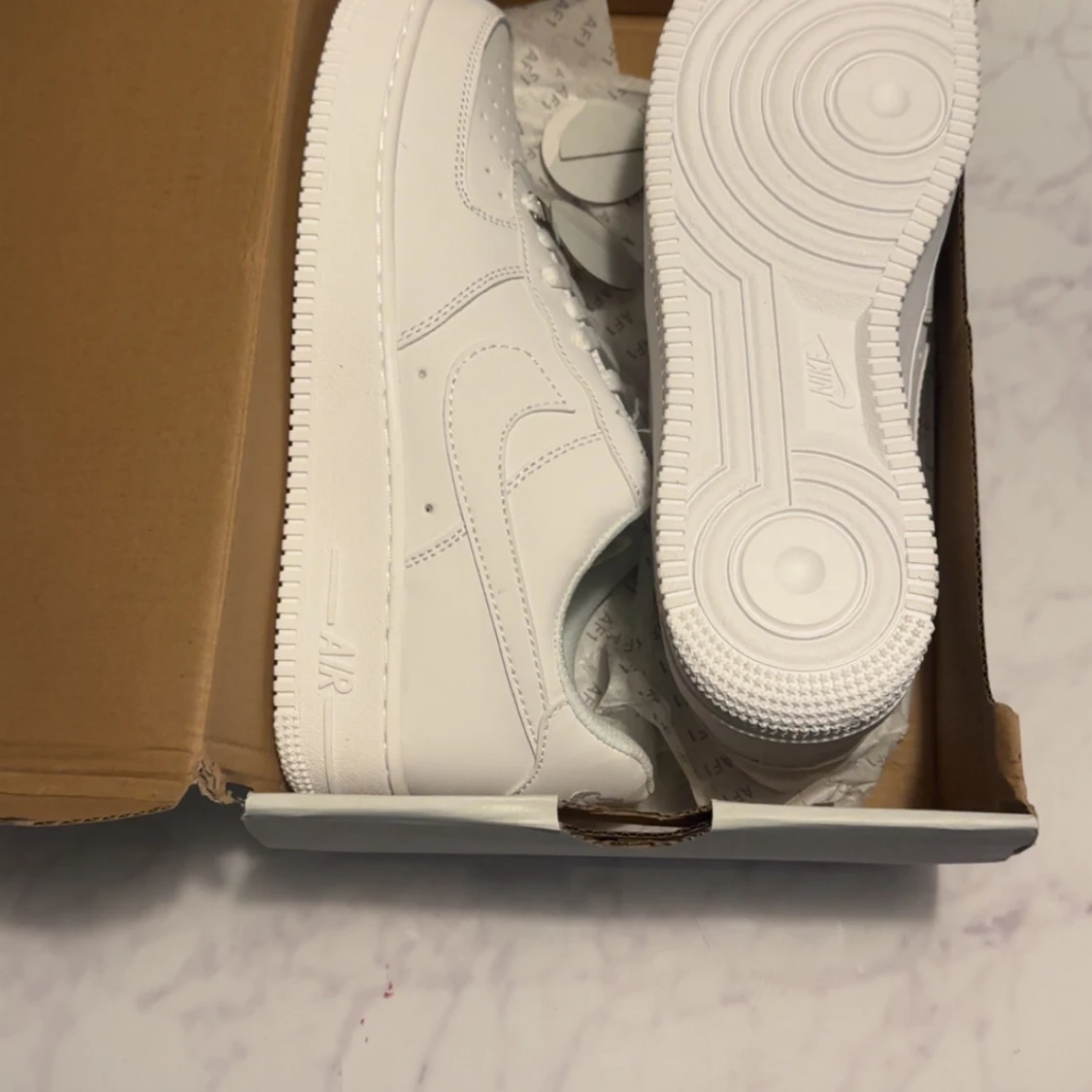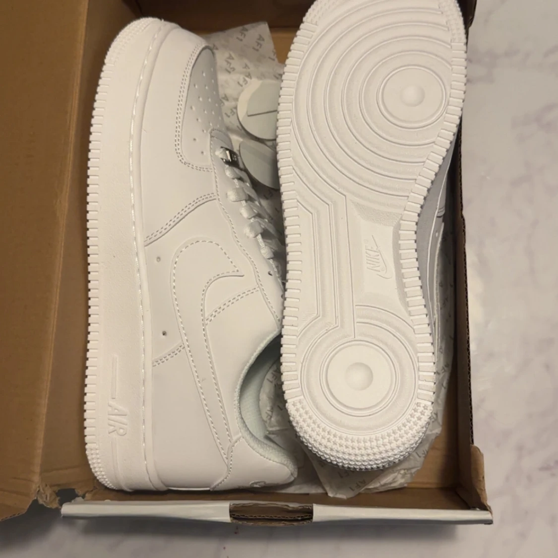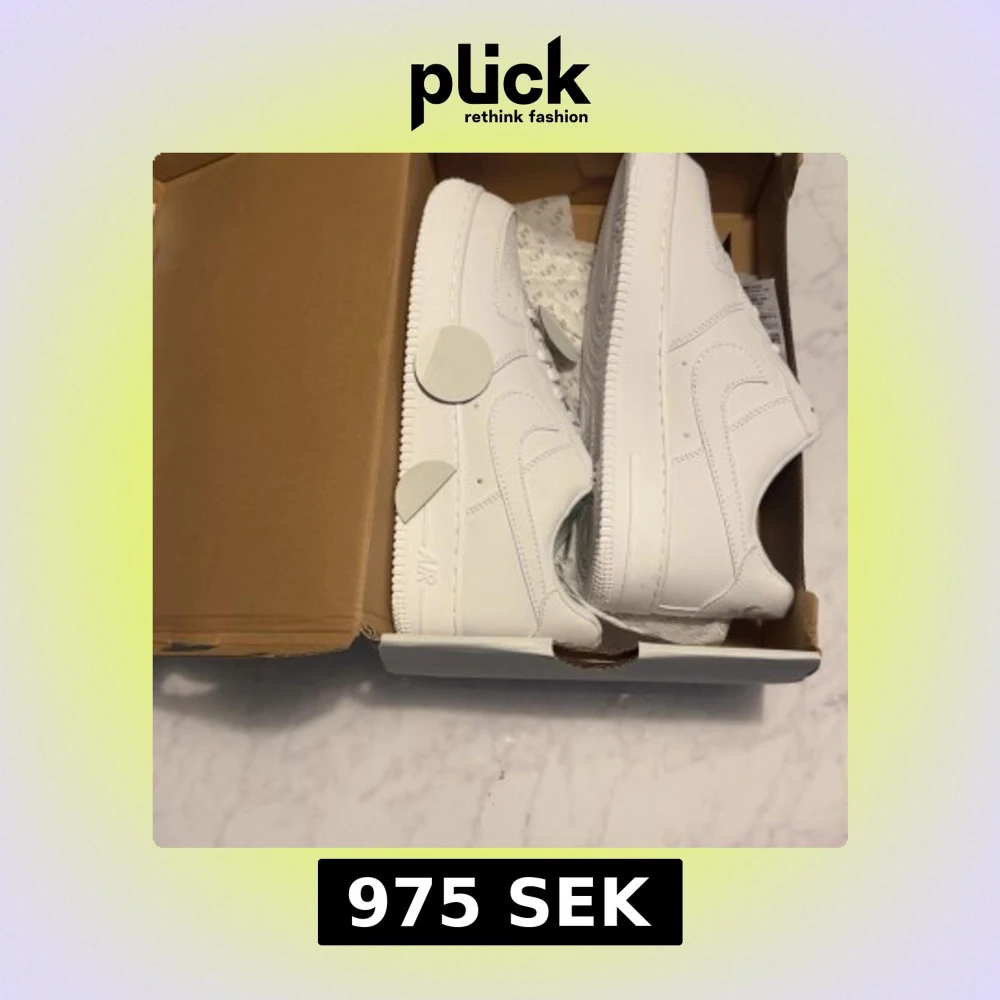 Fräscha Nike Air Force 1 sneakers i helvitt skinn med klassisk siluett och låg profil. Snygga detaljer som perforerad tå, snörning och den ikoniska swoosh-loggan på sidorna. Perfekta för dig som vill ha en clean och tidlös look.