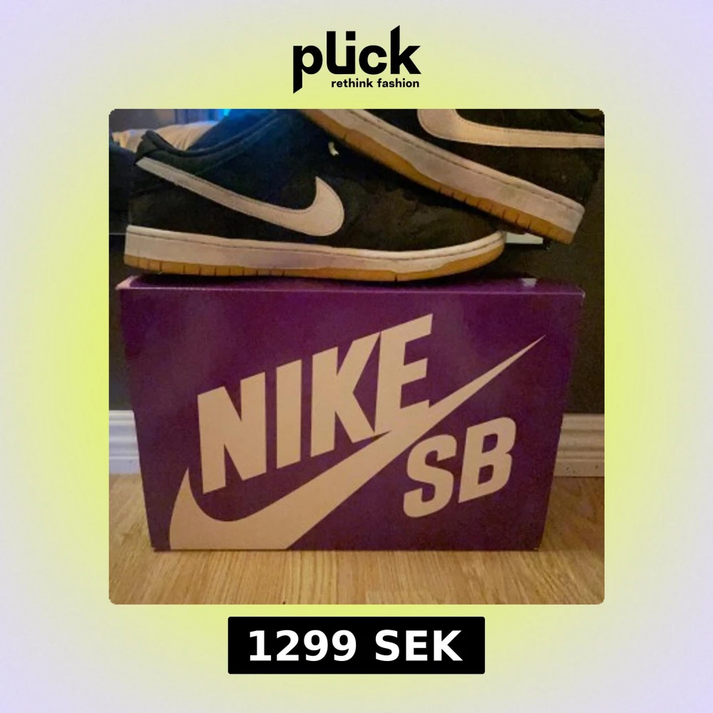 Säljer ett par svarta Nike SB Dunk sneakers med vit swoosh. Skorna har klassisk låg profil och är perfekta för dig som gillar streetwear eller skate. Kommer med originalkartong i lila med stor Nike SB-logga.