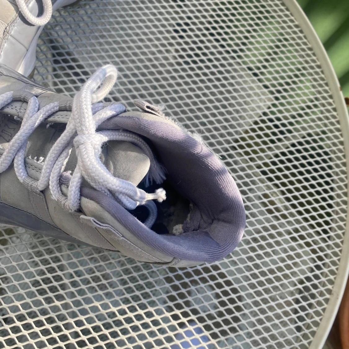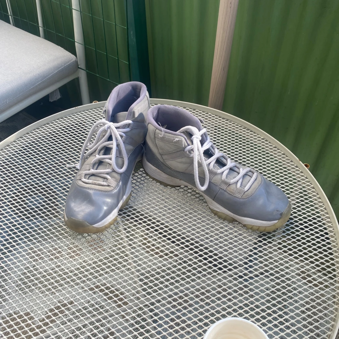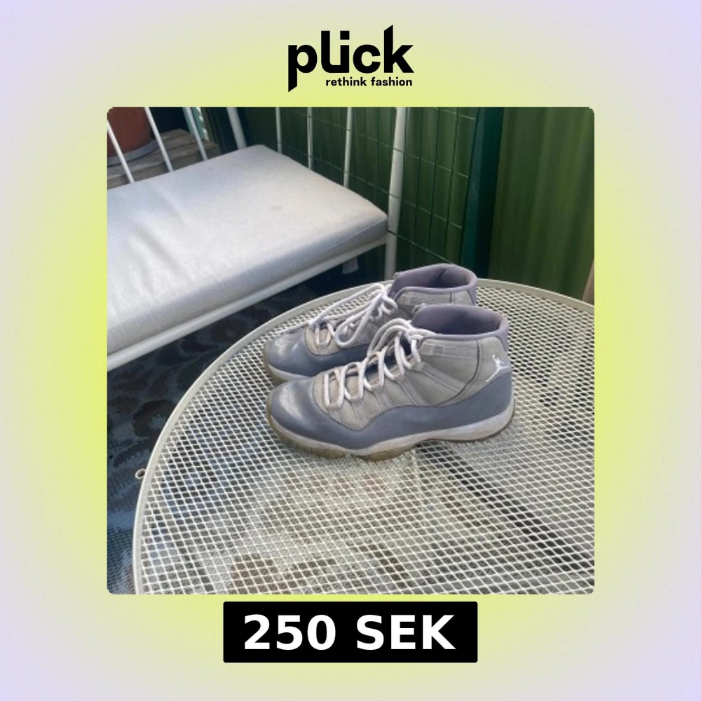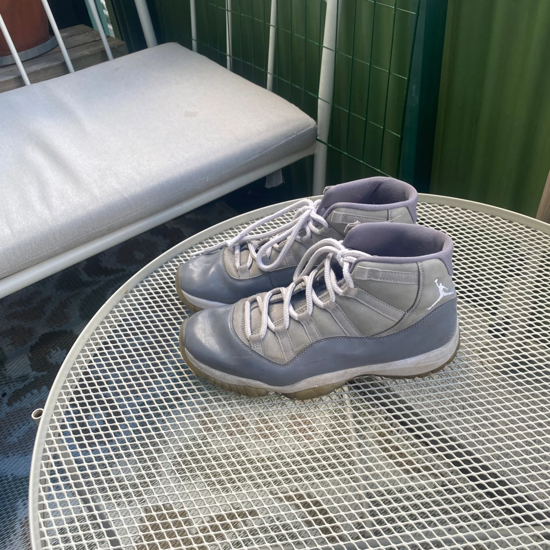 Säljer ett par Nike Air Jordan 11 i färgen Cool Grey. Skorna har en hög siluett, klassisk snörning och den ikoniska Jumpman-loggan på sidan. Ovandelen är i grått skinn och syntet med vita detaljer och genomskinlig sula. Perfekta för dig som gillar streetwear och sneakerskultur.
