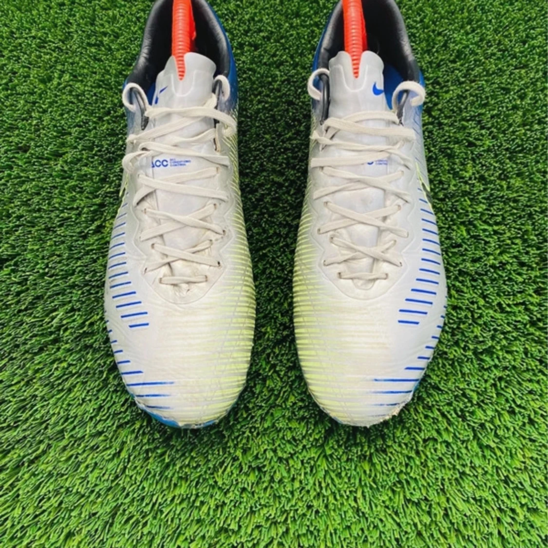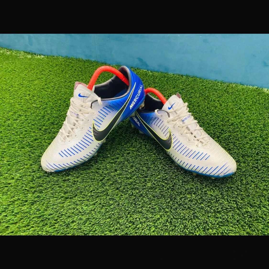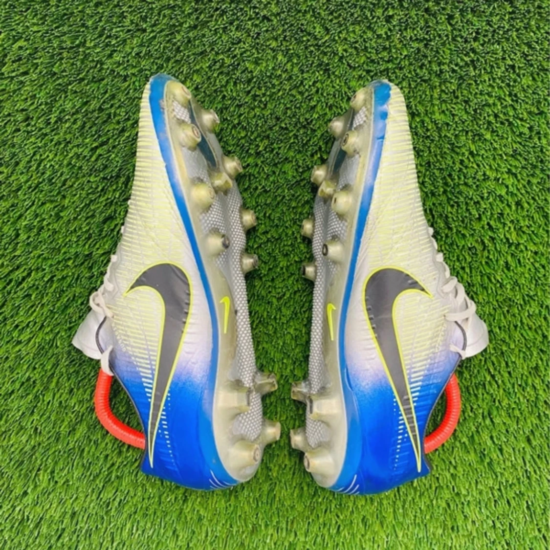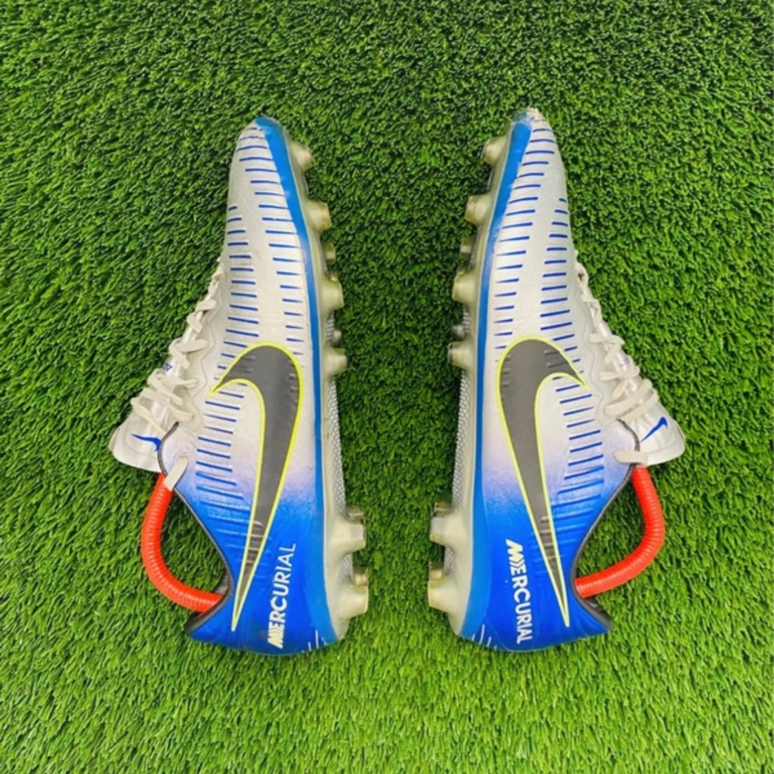Säljer ett par Nike Mercurial fotbollsskor i blått och vitt med svarta och gula detaljer. Skorna har snörning, rund tå och platt sula med dobbar för gräsplan. Perfekta för dig som vill ha lätta och snabba skor på planen. Neymar OG BOOTS