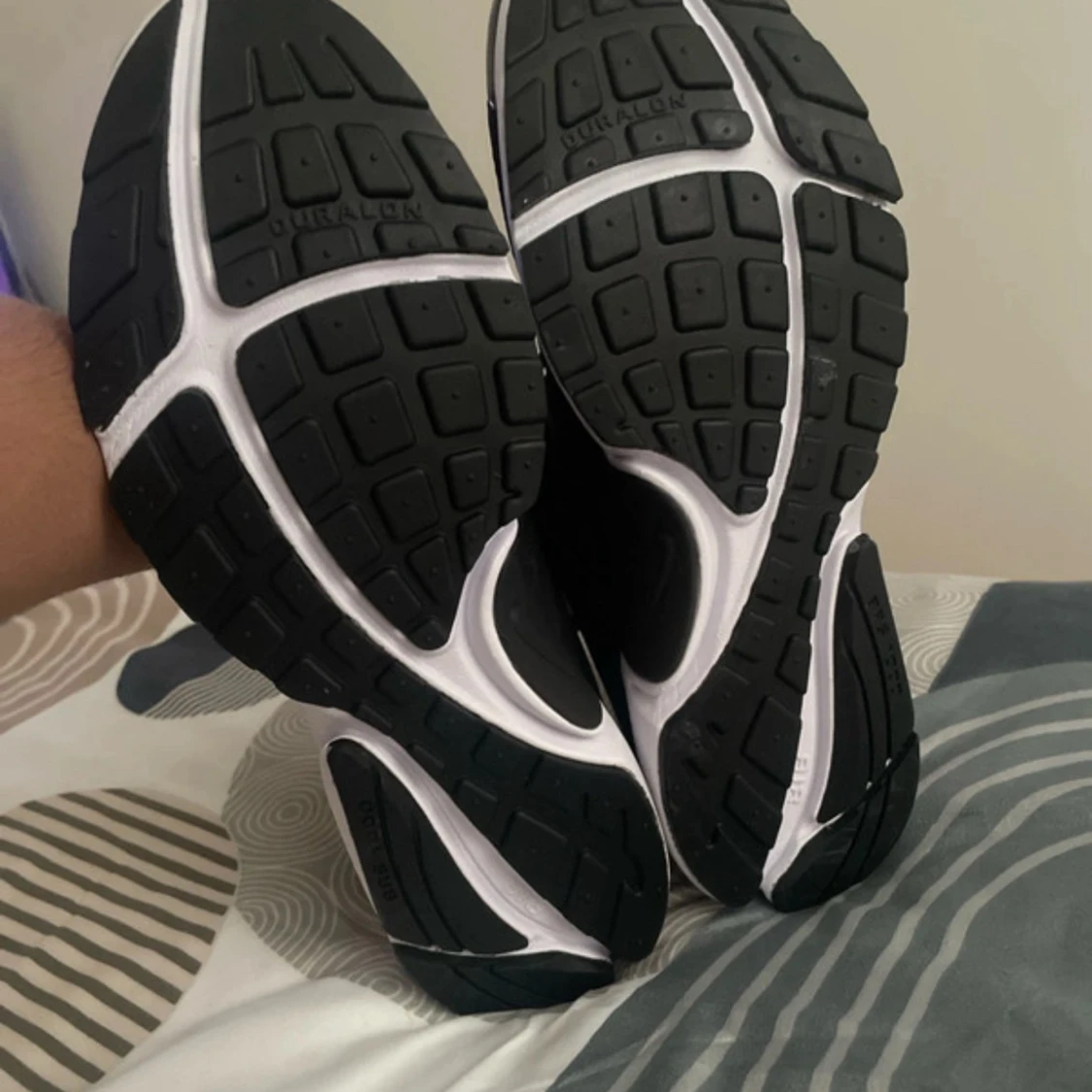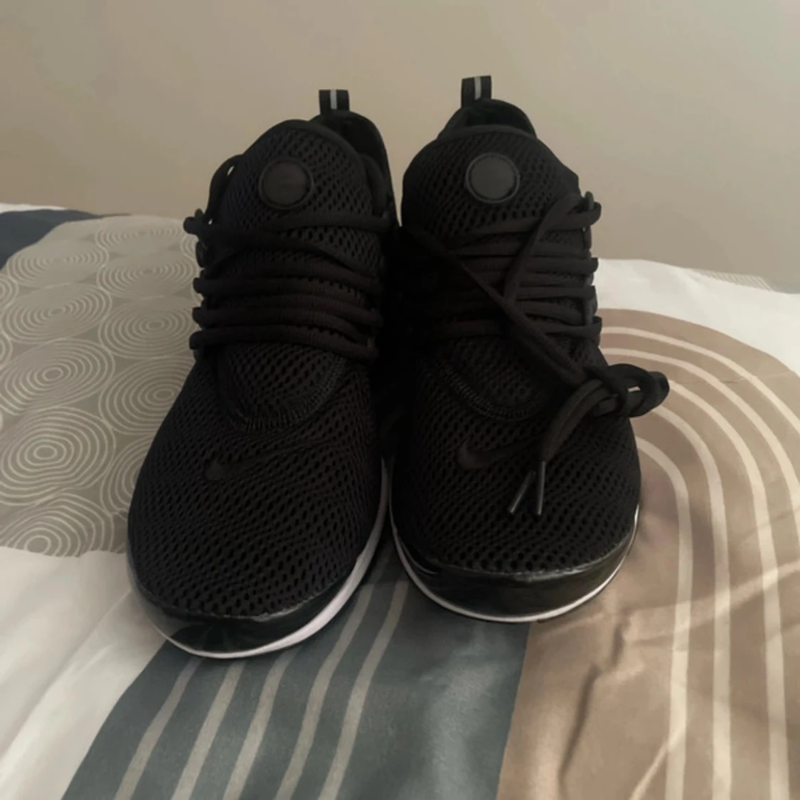 Svarta Nike Presto sneakers med vit sula och mesh-överdel. Skorna har snörning och en sportig, modern look med rund tå och platt sula. Perfekta för dig som gillar stilrena och bekväma sneakers med en clean vibe.