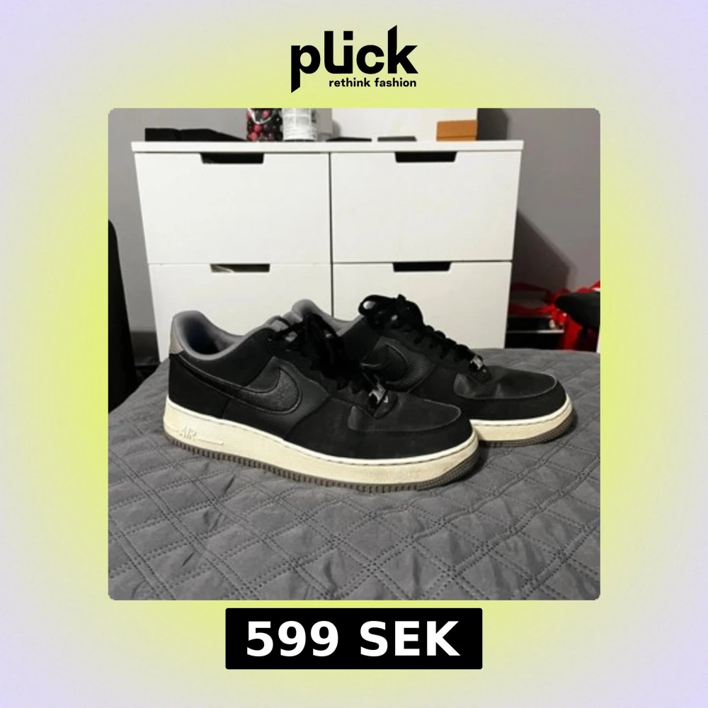 Svarta Nike Airforce 1 med gråa detaljer. Köpta i januari i år och använda varsamt. Nytvättade på bilderna och har inge som helst defekter. Storlek: 44 Frågor eller funderingar? Bara att höra av sig.
