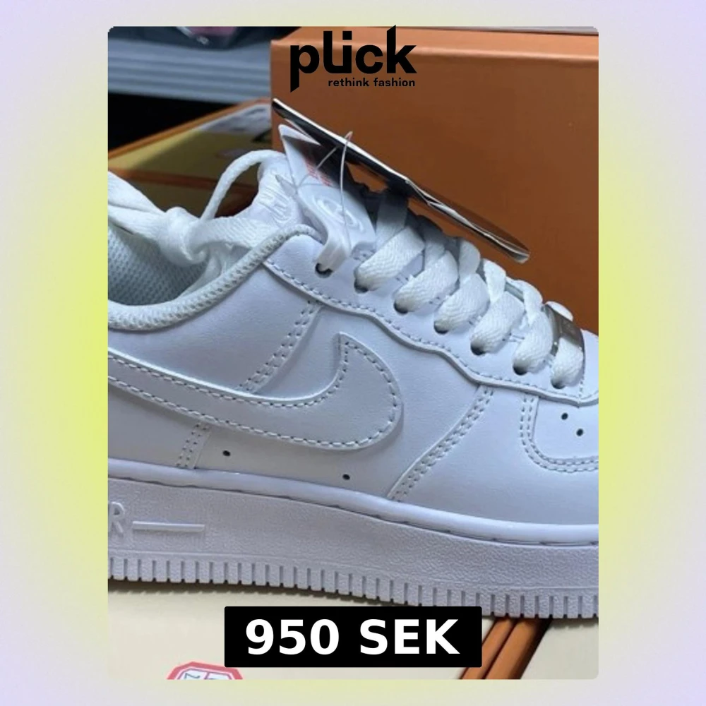 Fräscha Nike Air Force 1 sneakers i helvit färg. Skorna har snörning, rund tå och platt sula. Tillverkade i skinn med ventilerande hål på ovansidan och ikonisk Nike-logga på sidan och hälen. Perfekta för dig som gillar stilrena och tidlösa sneakers. Skorna är helt nya i låda.