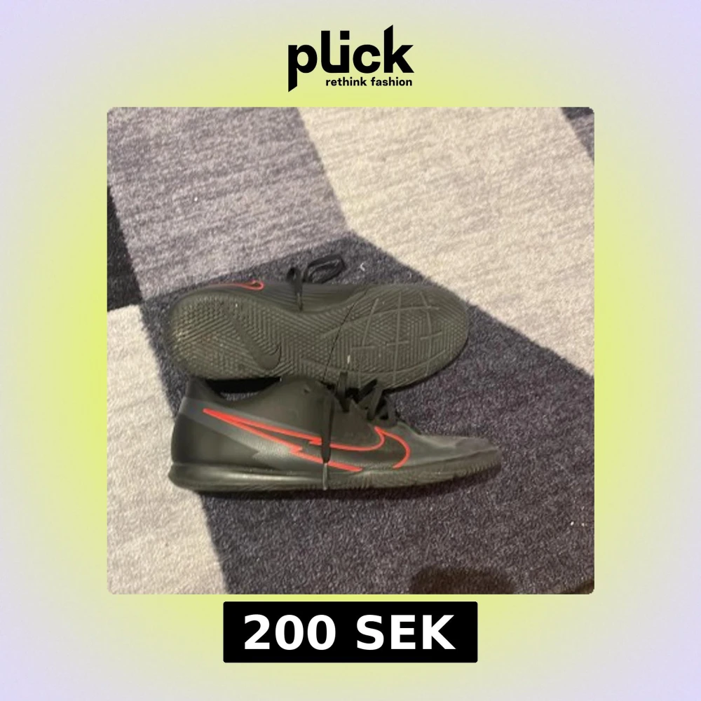 Säljer ett par svarta Nike fotbollsskor med röda detaljer och klassisk swoosh på sidan. Skorna har snörning och platt sula med mönster för bra grepp på planen. Perfekta för dig som vill sticka ut med stilren design och sportig känsla.